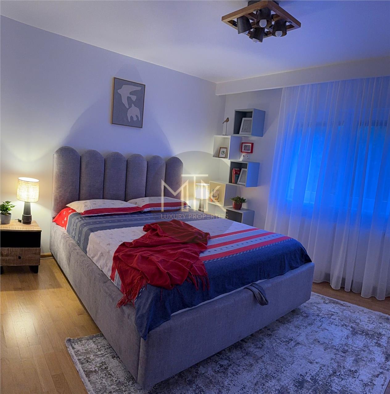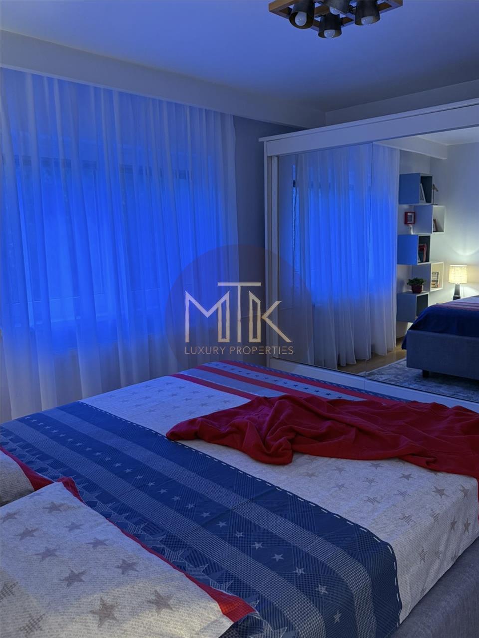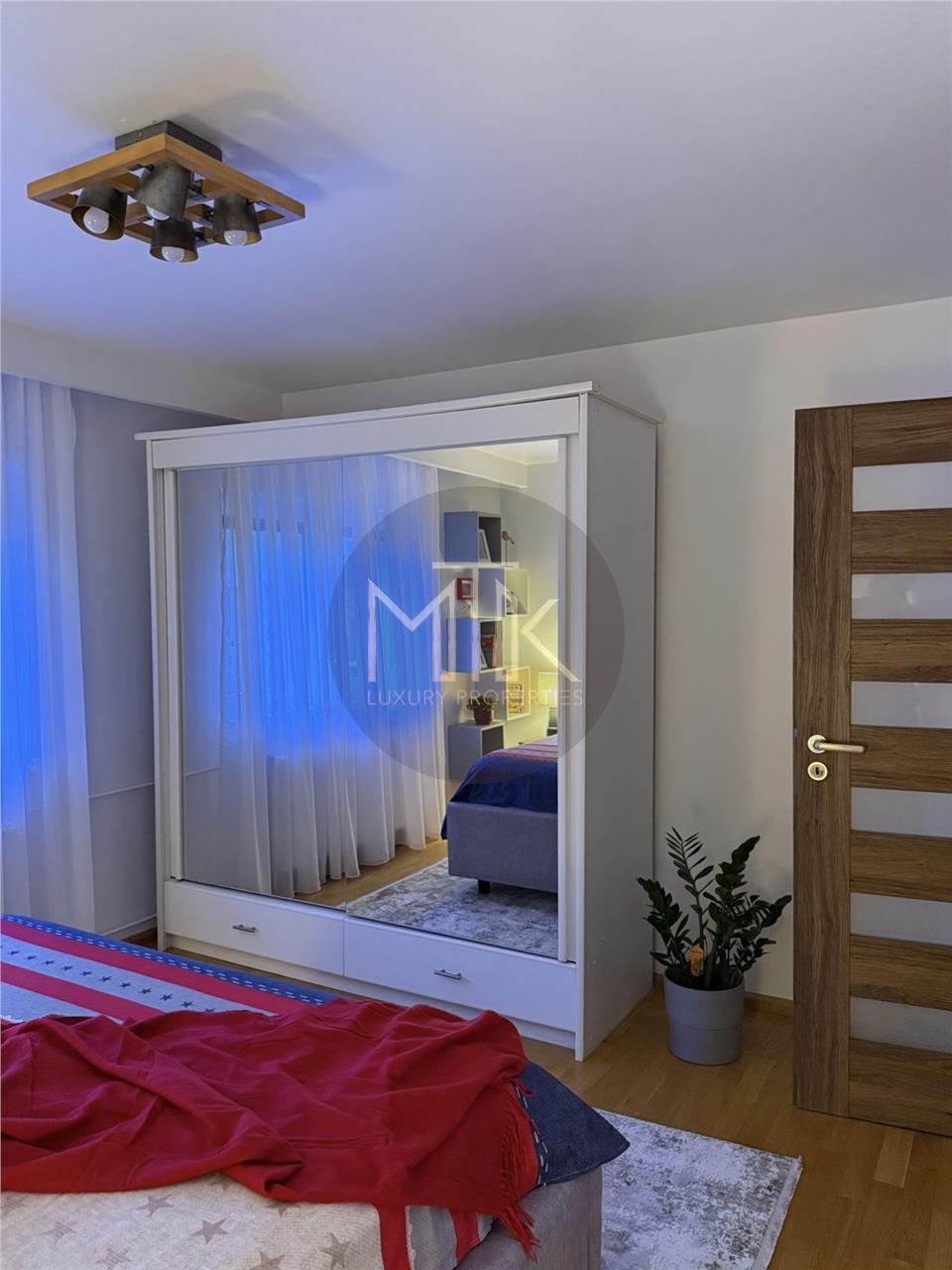 -Dormitorul beneficiaza de un pat king size cu saltea de 33 cm si cadru metalic premium, noptiere din lemn mango, dressing generos, oferind confort si eleganta. Mobilierul este nou.