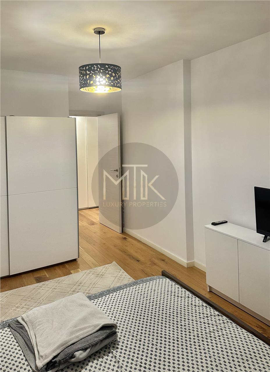 Apartamentul este compartimentat astfel: Living-ul este dotat cu Smart TV, canapea, zona de dining, iesire spre balcon, bucatarie inchisa, echipata cu electrocasnice de ultima generatie, 1 dormitor cu pat matrimonial, dressing, TV, 1 baie dotata cu cada si 1 hol ce decomandeaza camerele facil, unde se aflla si un dressing incapator.
