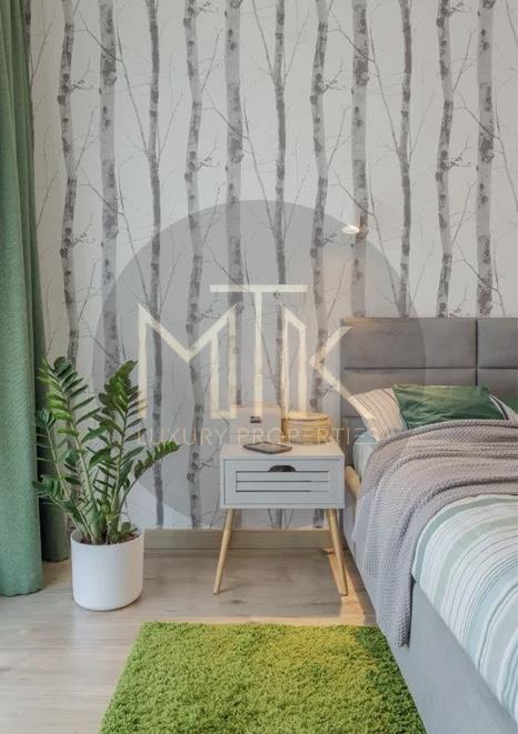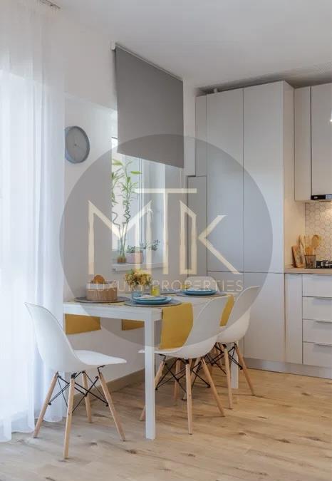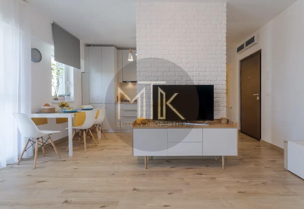 Apartamentul este compus dintr-un living spatios cu o bucatarie open space si zona de dining, un dormitor matrimonial cu baie proprie, o baie secundara, un hol si o terasa de 7mp cu vederea spre interiorul complexului. Apartamentul dispune de incalzire in pardoseala, aer conditionat in toate camerele - prin sistem multisplit.