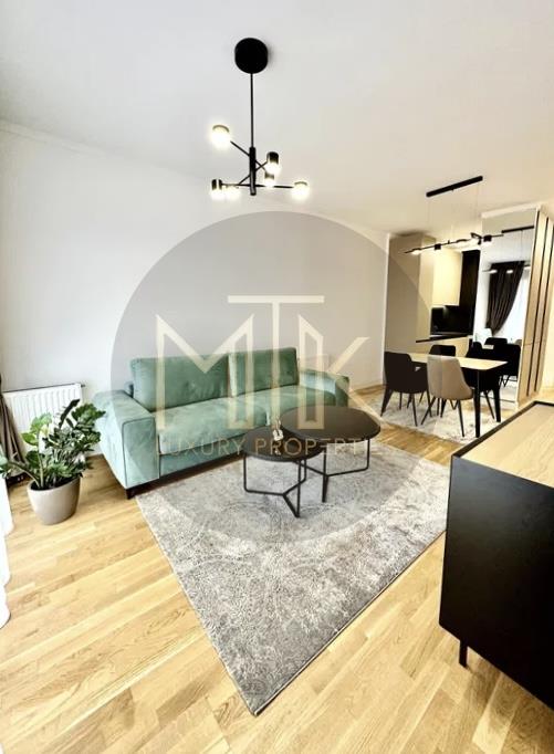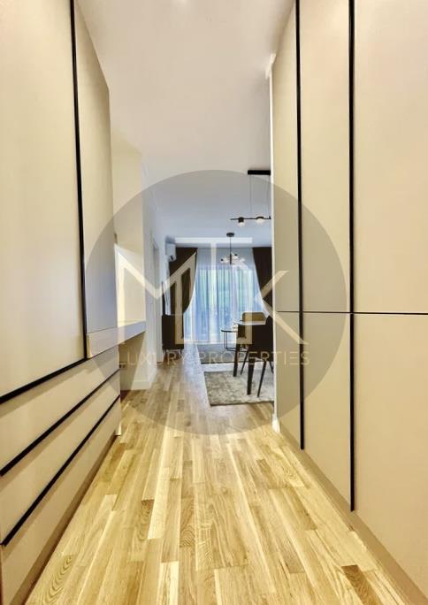 Apartamentul este situat la etajul 7 intr-un imobil cu regim de inaltime P+10 si este format dintr-un living spatios, o bucatarie open space cu zona de dining complet mobilata si utilata, un dormitor cu pat king size, o baie, un hol de acces cu dressing incorporat pe tot peretele, si o terasa cu vedere in interiorul complexului. Apartamentul este primitor si luminos si dispune de spatii mari vitrate.