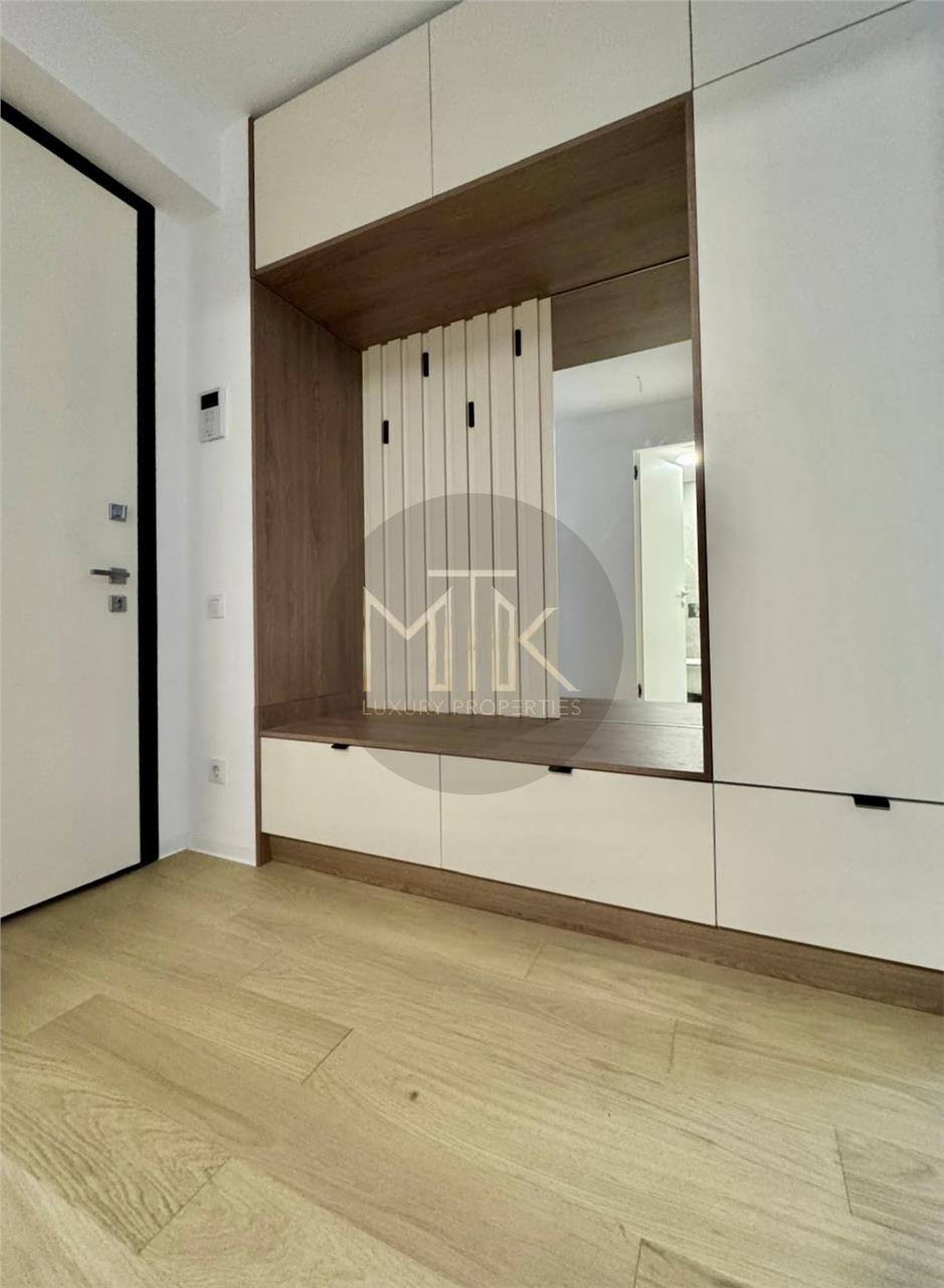 Apartamentul are 2 camere, o suprafata de 56 mp si este compartimentat astfel: Living modern, dotat cu canapaea, smart tv, birou, cu iesire spre terasa, bucatarie open-space complet utilata (inclusiv masina de spalat vase si rufe), 1 dormitor confortabil cu dressing generos, 1 baie moderna cu cabina de dus walk-in si un dressing pozitionat la intrarea in apartament.