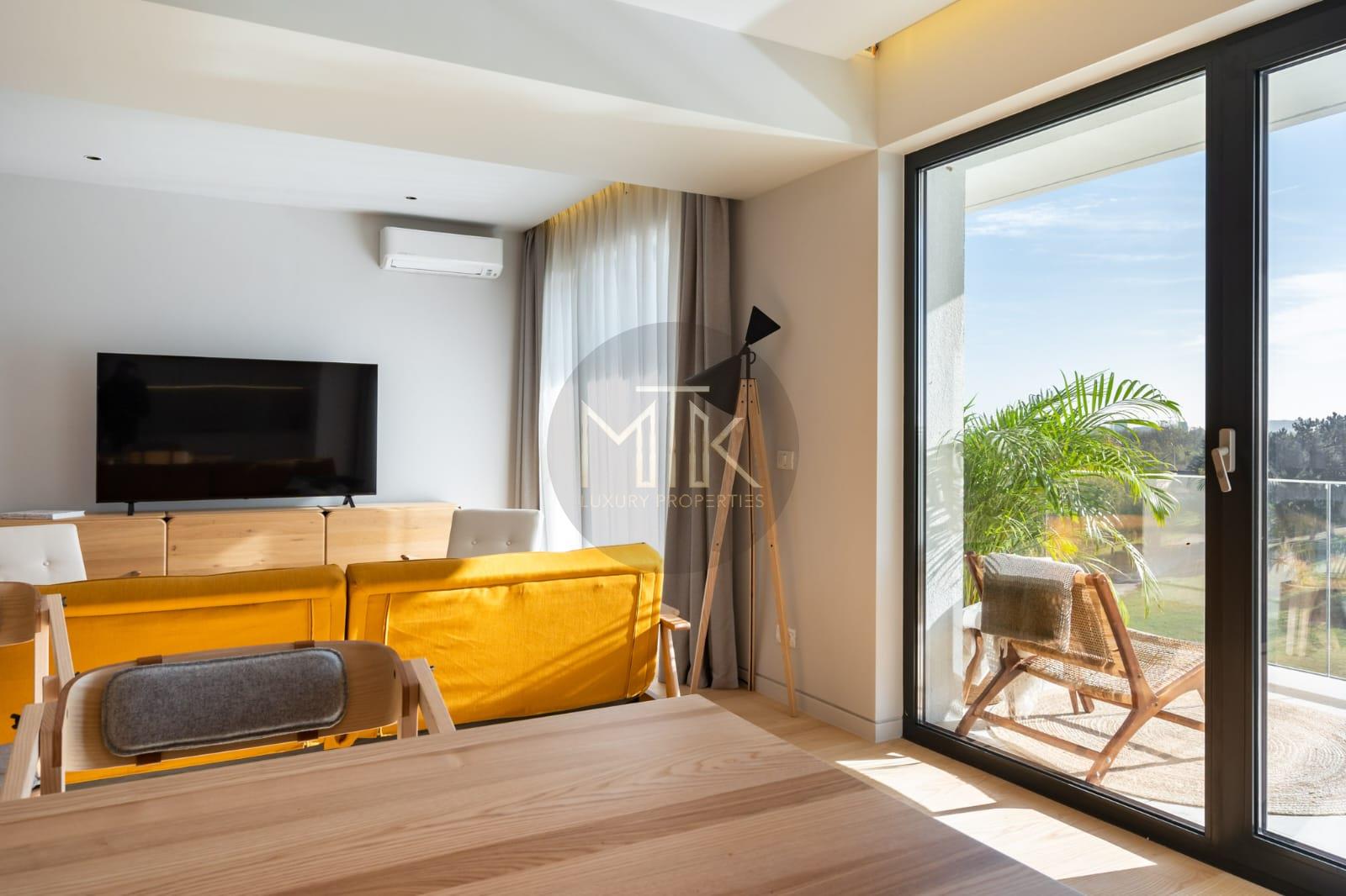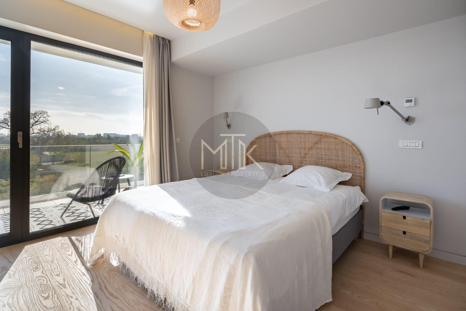 Apartamentul este compus dintr-un living luminos si spatios, o bucatarie open space, dormitor matrimonial, dressing de tip walk in, o baie cu cada si o a doua baie cu dus de tip walk in, un hol de acces, terasa mobilata de 50 mp cu vederea spre lac si acces atat din living cat si din dormitor.