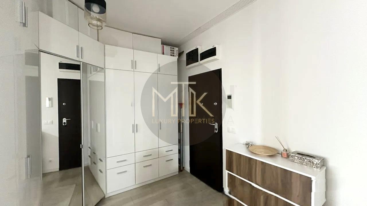 Apartamentul este situat la etajul 7/8, este compus dintr-un living spatios, bucatarie deschisa, dormitor cu dressing, o baie cu cada, hol de acces cu dressing si un balcon mobilat. Terasa este placata cu gresie antiderapanta portelanata.