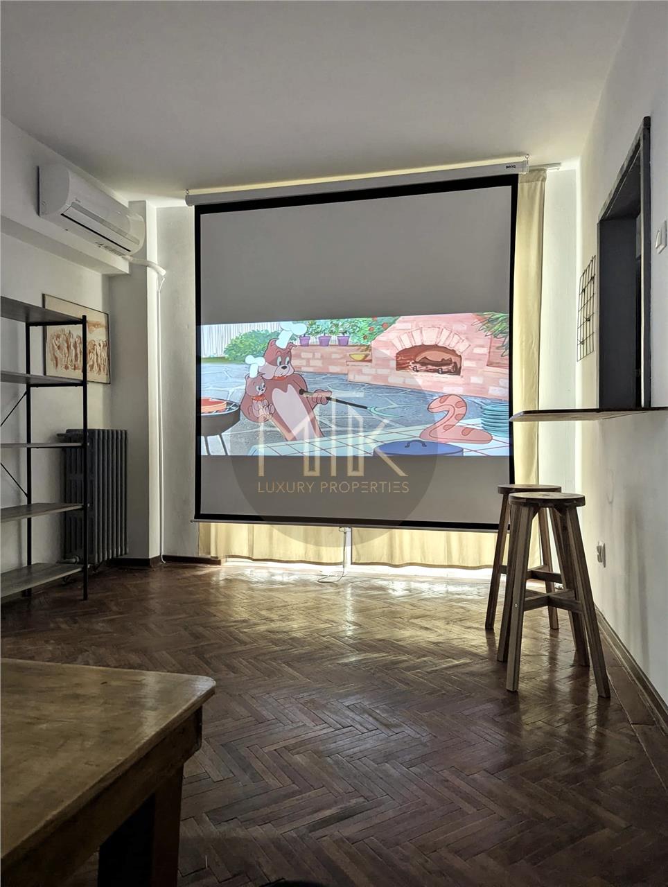 -Livingul este un spatiu luminos si aerisit, in care elementele moderne se imbina armonios cu cele vintage. In locul unui televizor clasic, acesta dispune de videoproiector, oferind o experienta cinematografica autentica chiar in confortul propriei locuinte – serile de film devin o adevarata placere, iar atmosfera seamana cu cea a unui mic cinematograf privat;