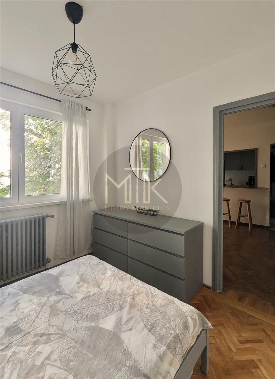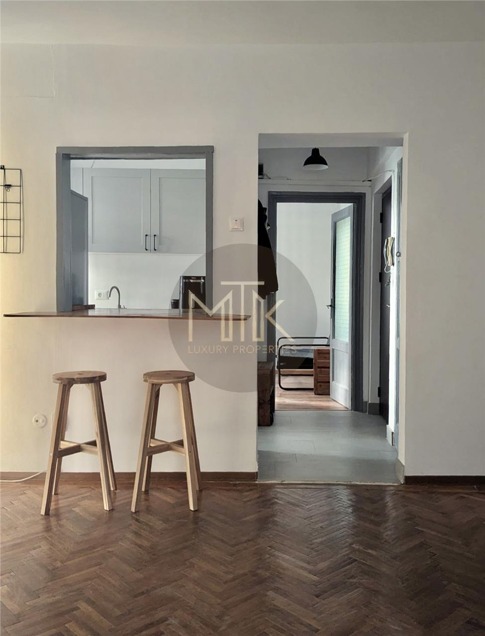 Apartamentul are o suprafata utila de 60 mp, o compartimentare eficienta si este situat la etajul 2 din 6 intr-un imobil bine intretinut. Cu o suprafata echilibrata si o compartimentare practica, locuinta imbina perfect eleganta clasica cu accentele moderne. Designul interior pastreaza o parte din farmecul vintage al mobilierului, reconditionat cu grija, completat de finisaje contemporane si dotari actuale, oferind o atmosfera calda, sofisticata si echilibrata.