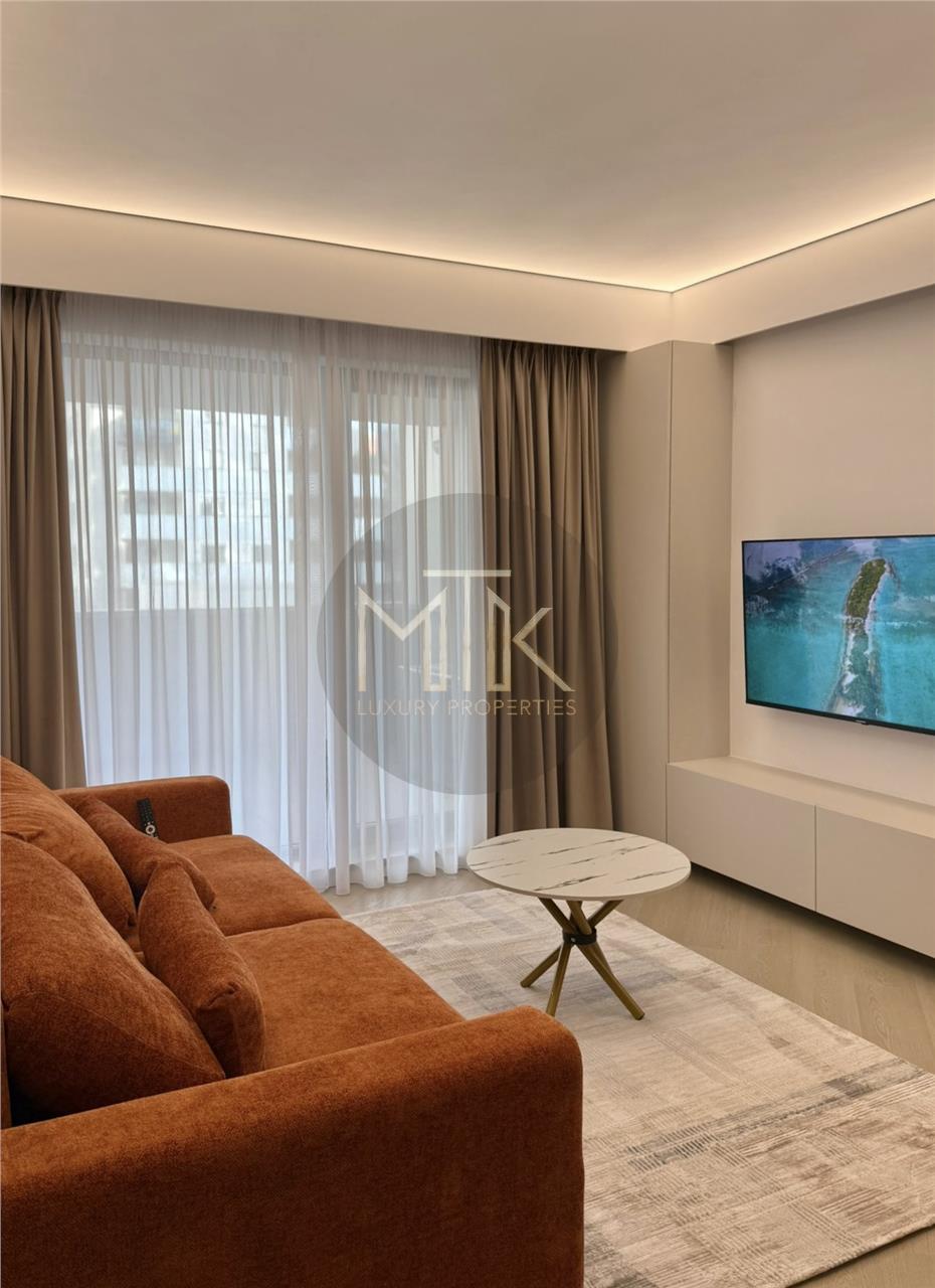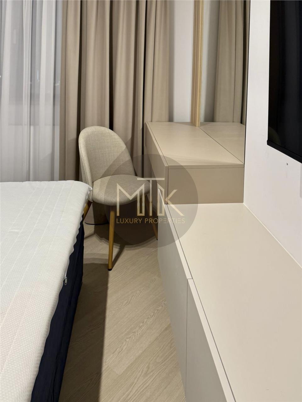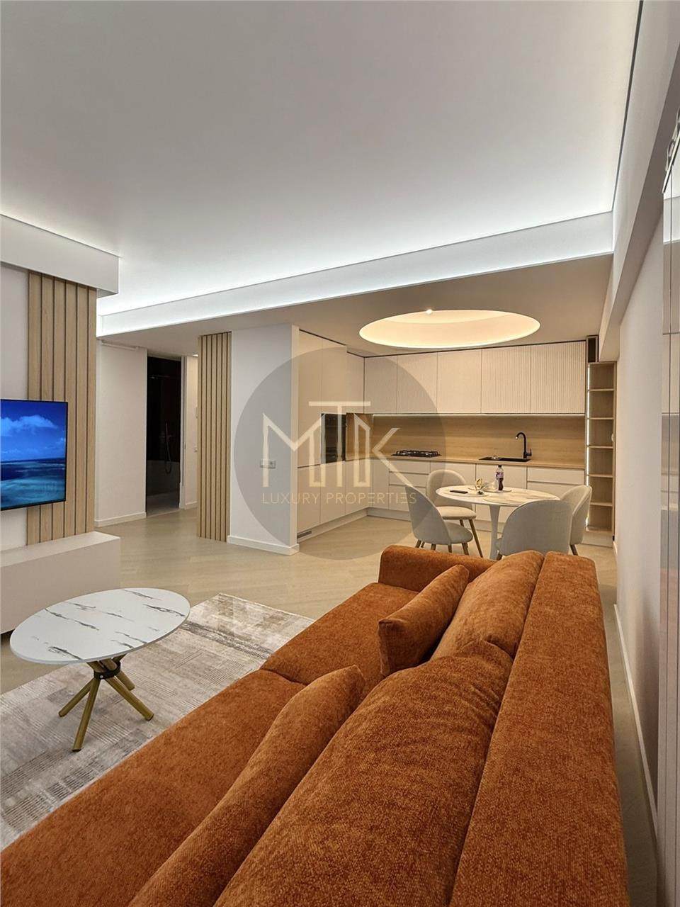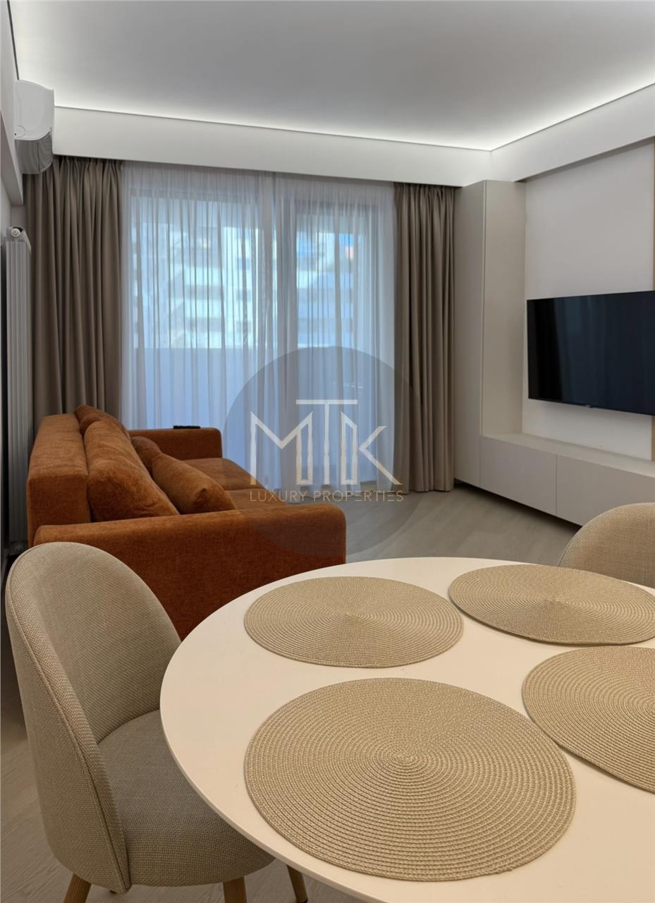 Apartamentul se afla la etajul 1 intr-un bloc cu regim de inaltime S+P+10 si este format dintr-un living luminos open-space cu zona de dining, cu iesire pe terasa de 8 mp, are o canapea generoasa, smart tv, bucatarie deschisa echipata complet, 1 dormitor generos cu pat king-size si dressing, al 2-lea dormitor dotat cu dressing si canapea si 2 bai: una cu cada (prezenta in dormitorul matrimonial), iar cealalta cu cabina de dus de tip walk-in si un hol eficient ce delimiteaza zona de zi cu cea de noapte, unde se regasesc multiple spatii de depozitare.