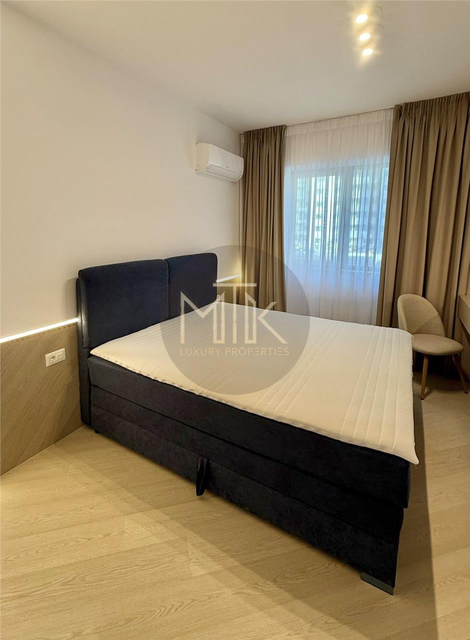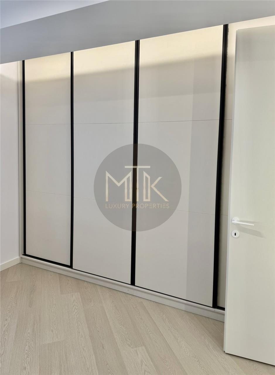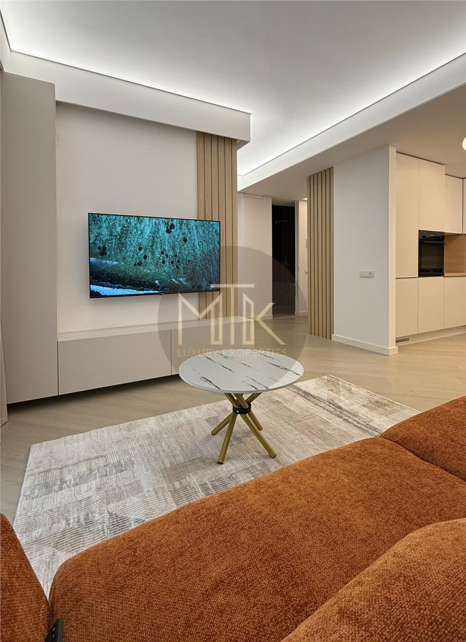 Apartamentul se afla la etajul 1 intr-un bloc cu regim de inaltime S+P+10 si este format dintr-un living luminos open-space cu zona de dining, cu iesire pe terasa de 8 mp, are o canapea generoasa, smart tv, bucatarie deschisa echipata complet, 1 dormitor generos cu pat king-size si dressing, al 2-lea dormitor dotat cu dressing si canapea si 2 bai: una cu cada (prezenta in dormitorul matrimonial), iar cealalta cu cabina de dus de tip walk-in si un hol eficient ce delimiteaza zona de zi cu cea de noapte, unde se regasesc multiple spatii de depozitare.