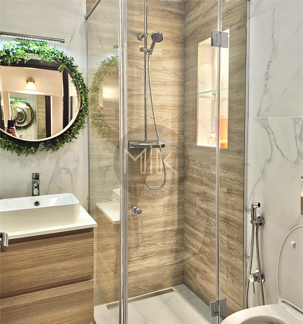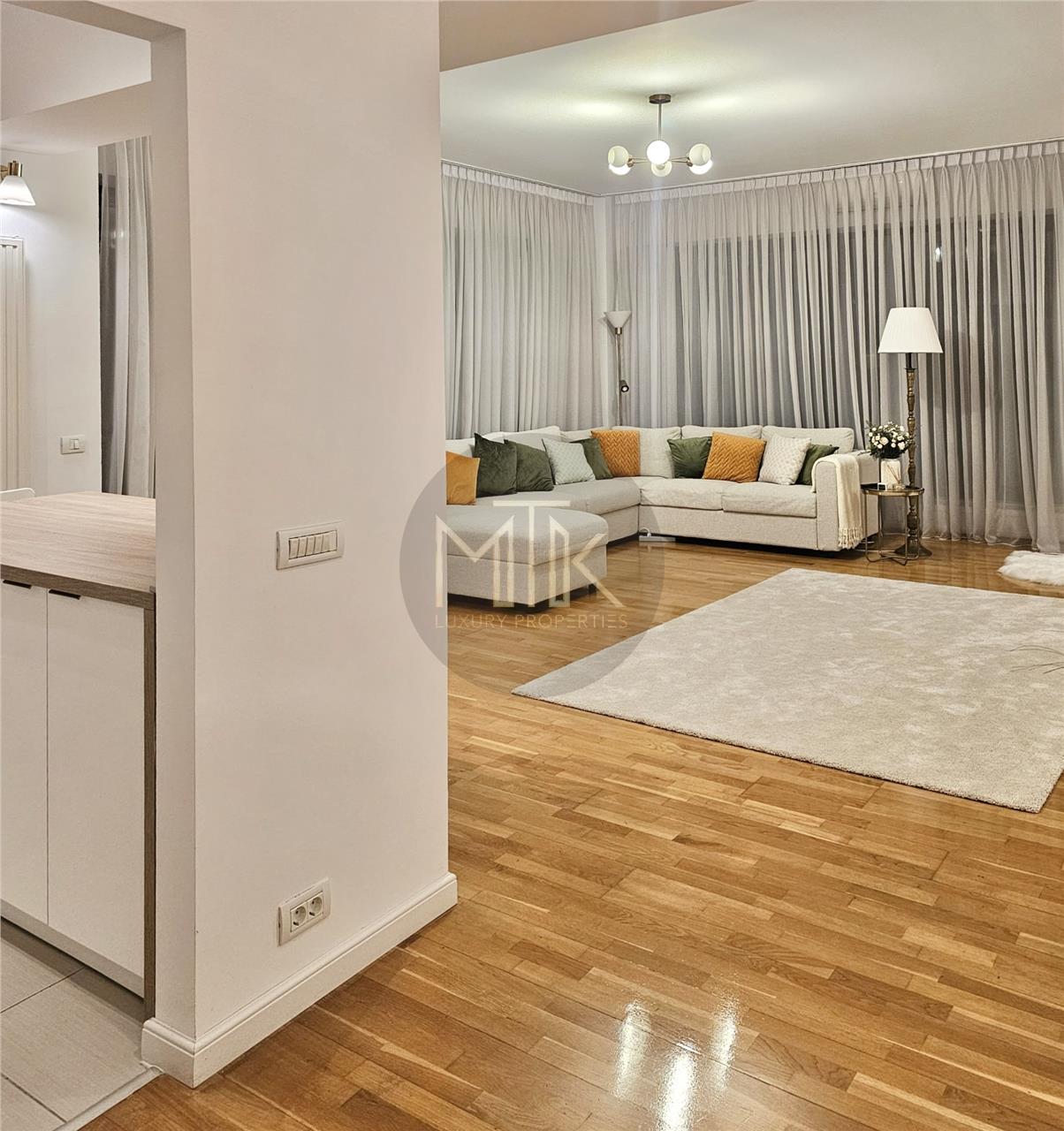 Apartamentul dispune de o suprafata utila de 108 mp si o terasa de 36 mp, cu o compartimentare inteligenta: living luminos cu iesire directa pe terasa, care este mobilata corespunzator, bucatarie open-space complet echipata, 1 dormitor matrimonial cu dressing si baie proprie dotata cu cabina de dus walk-in, 1 dormitor secundar cu pat extensibil, ideal pentru copil, birou sau oaspeti, hol spatios, dressing si inca 1 baie, dotata cu cabina de dus. Finisajele sunt rafinate, atent alese, iar iluminatul ambiental contribuie la o atmosfera moderna si eleganta.
