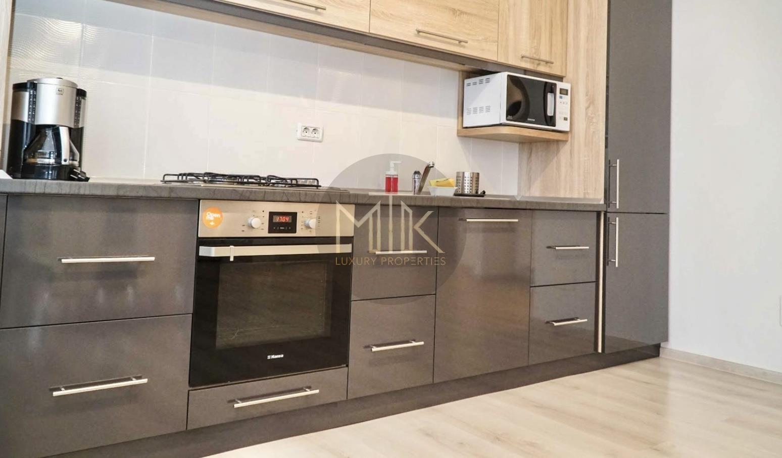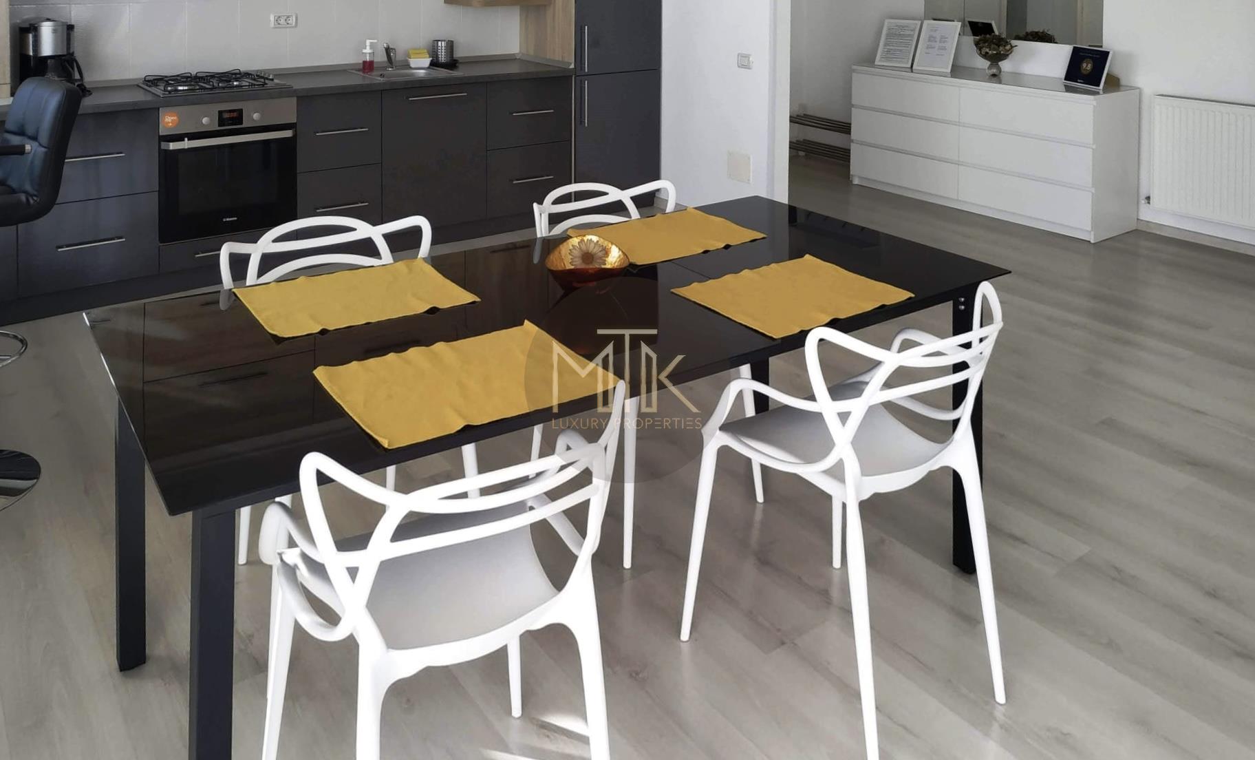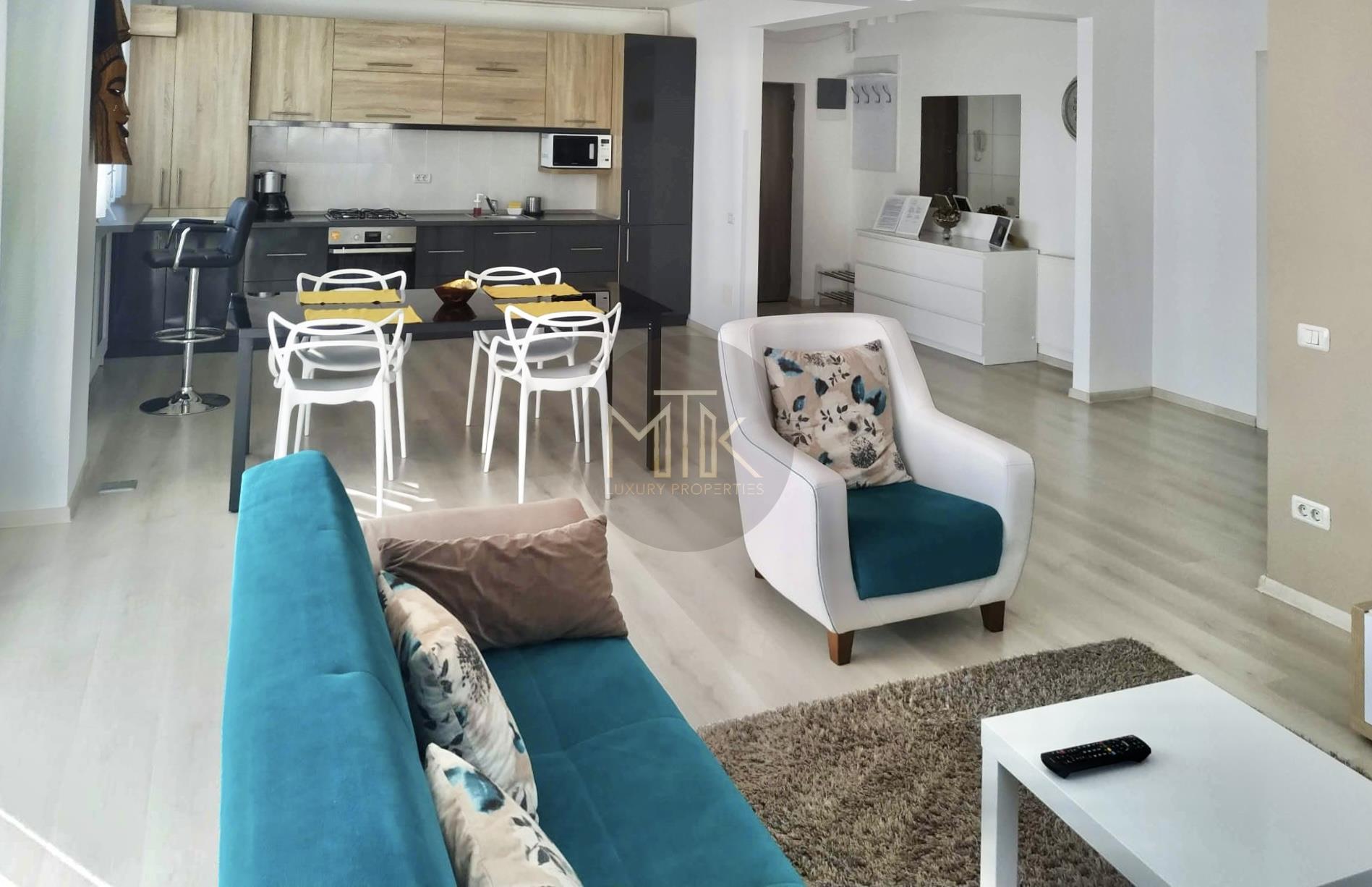 -Living open-space cu bucatarie moderna, complet mobilata si utilata (inclusiv masina de spalat vase, microunde), integrand si zona de dining, ideal pentru seri relaxante sau intalniri cu prietenii;