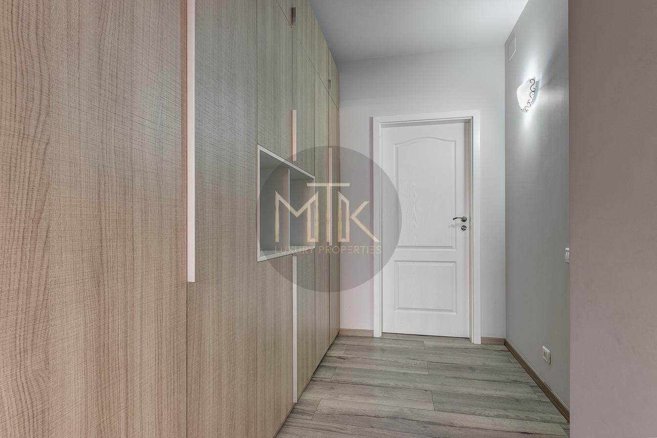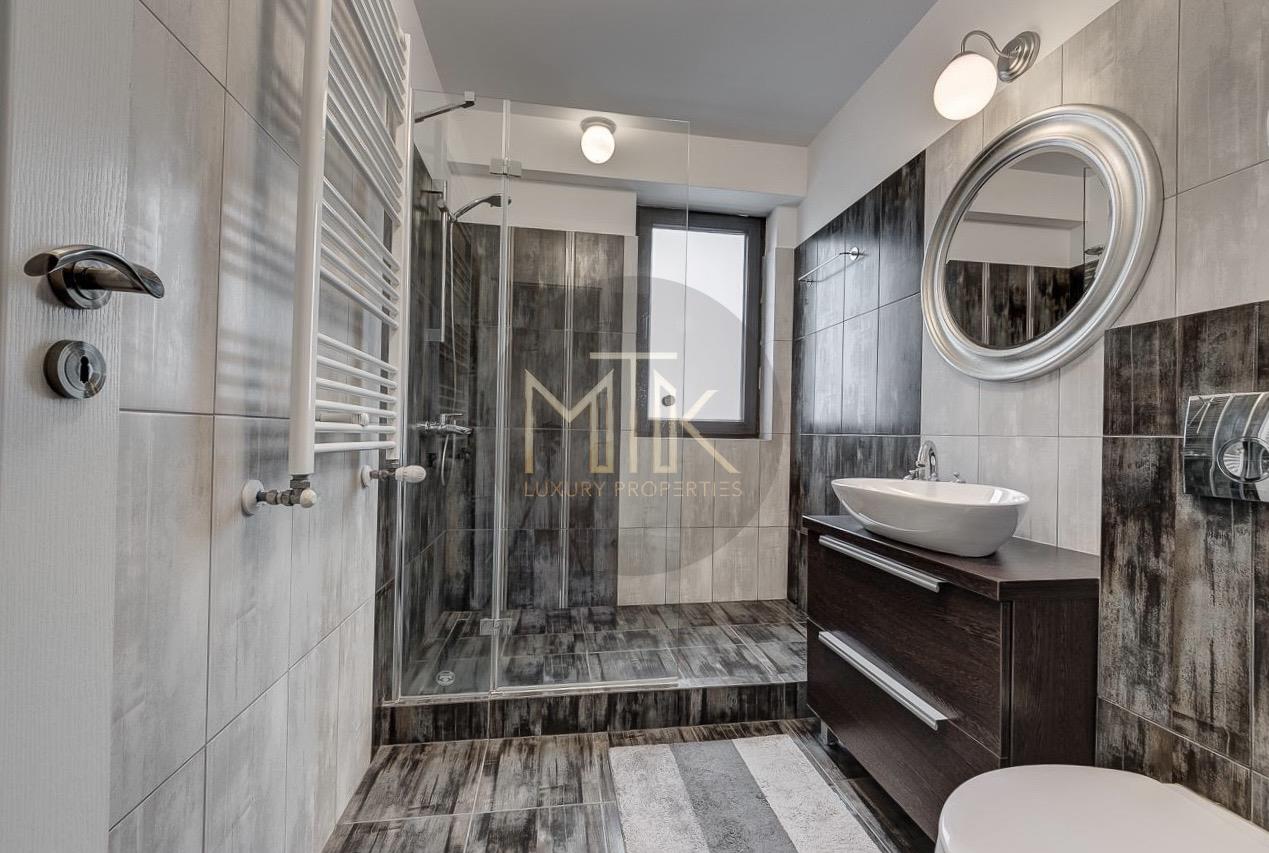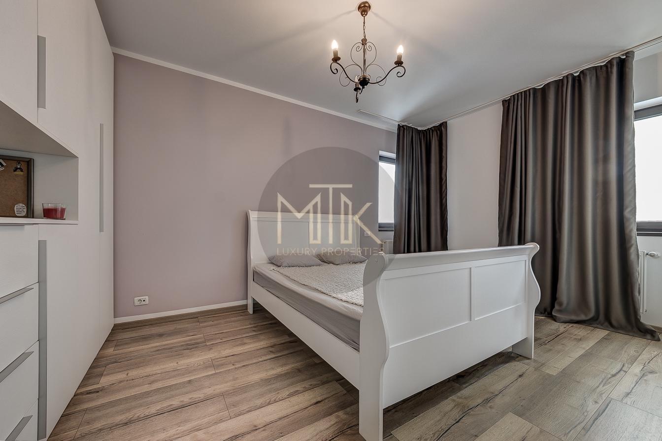 Apartamentul dispune de o suprafata utila de 83 mp si o terasa de 6 mp, cu o compartimentare inteligenta: living luminos cu zona de dining si iesire directa pe terasa, 1 bucatarie separata complet mobilata si utilata, 1 dormitor matrimonial cu pat king-size, dressing pe tot peretele si baie proprie dotata cu cada, 1 dormitor secundar cu pat, comoda, ideal pentru copil, birou sau oaspeti, cu iesire proprie pe terasa, 1 hol spatios, spatii de depozitare si inca 1 baie, dotata cu cabina de dus. Finisajele sunt rafinate, atent alese, iar iluminatul ambiental contribuie la o atmosfera moderna si eleganta.