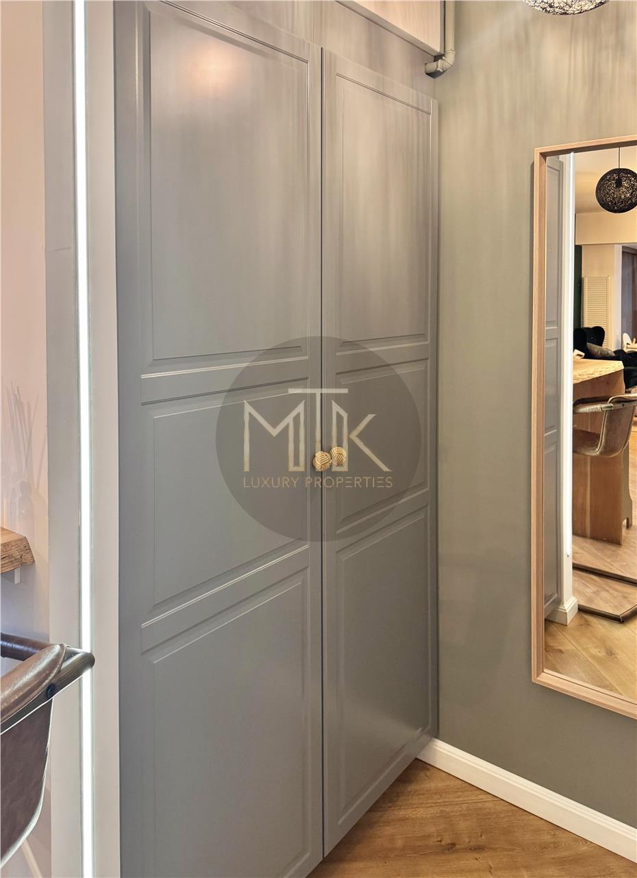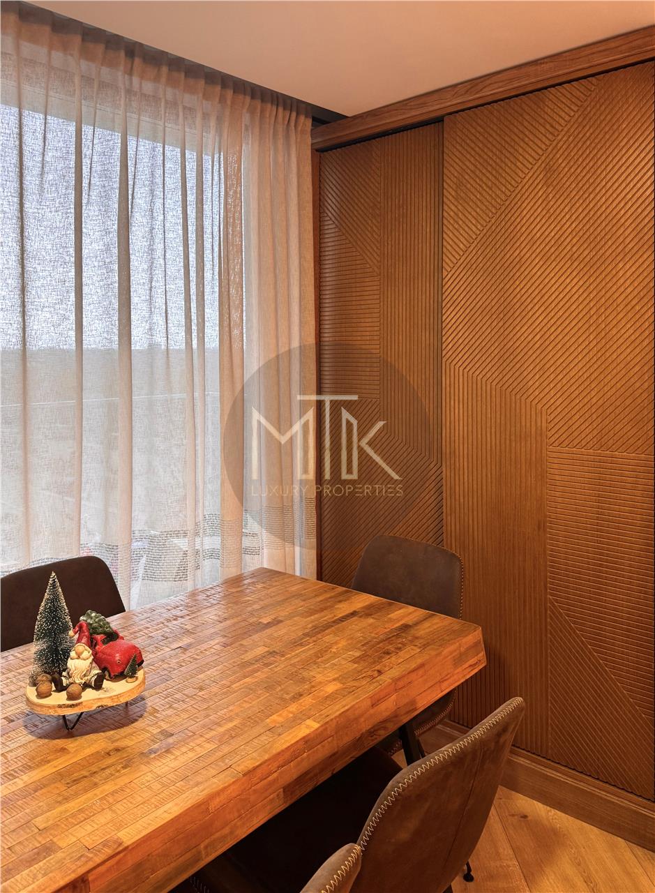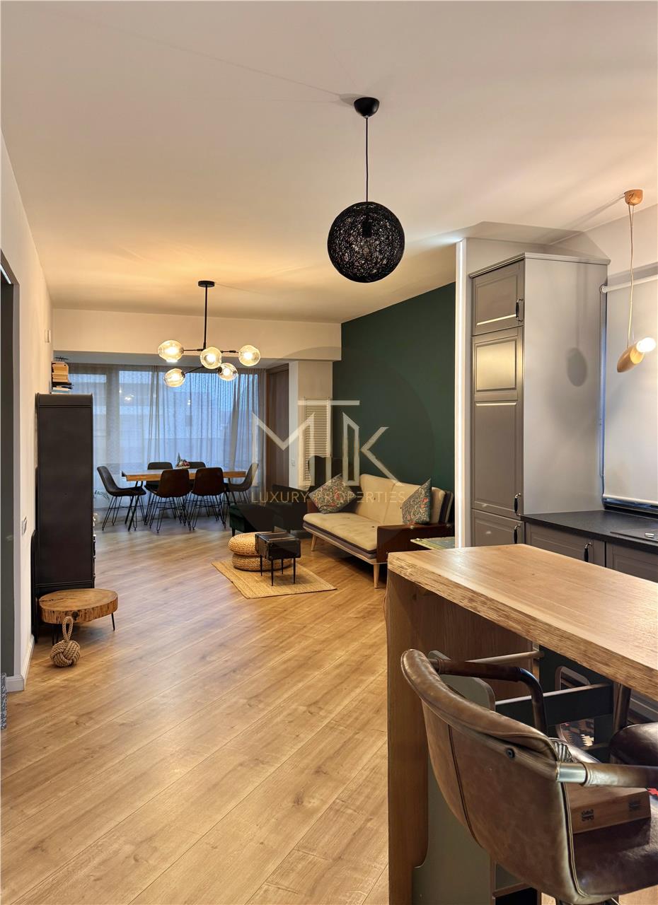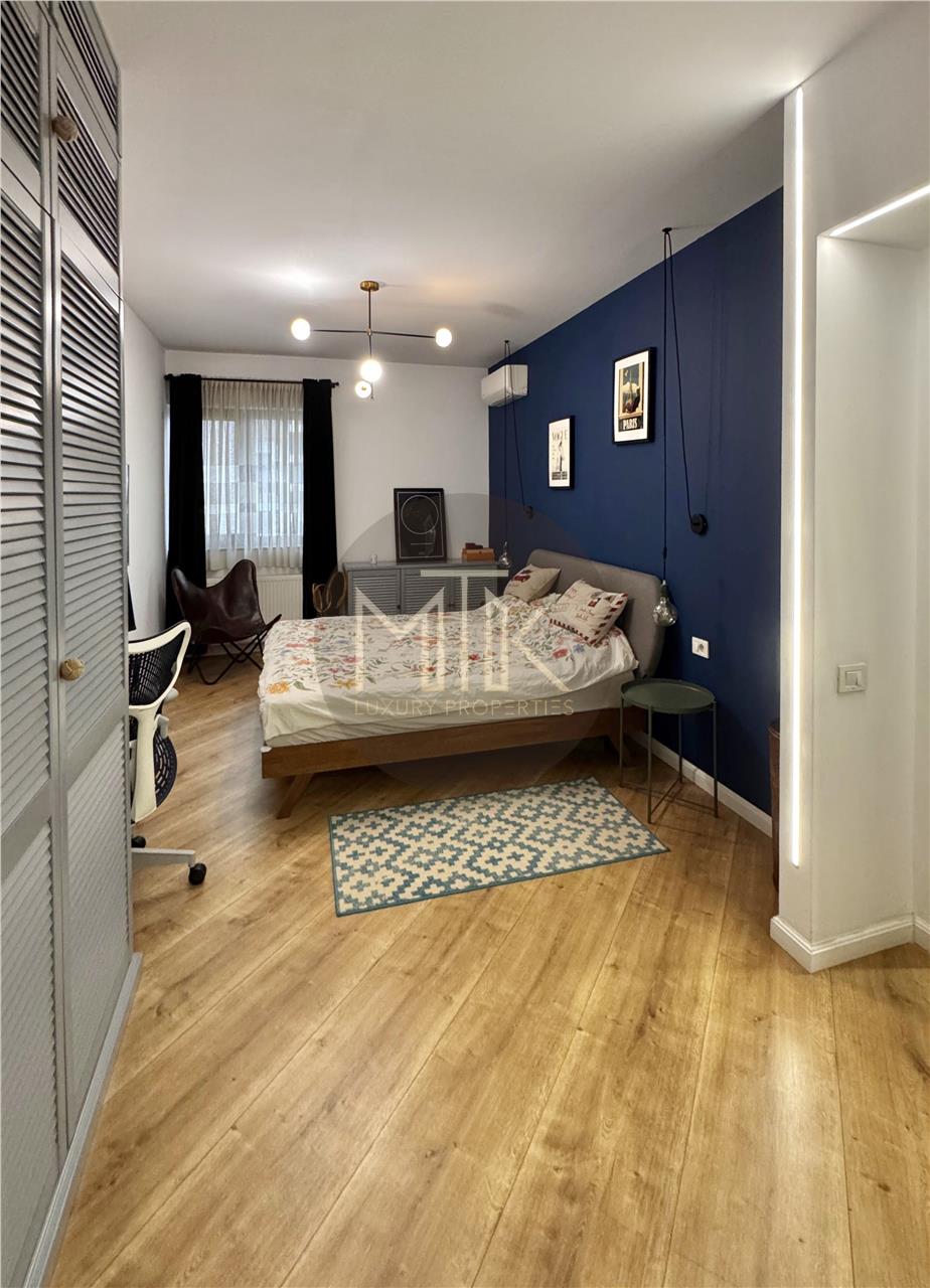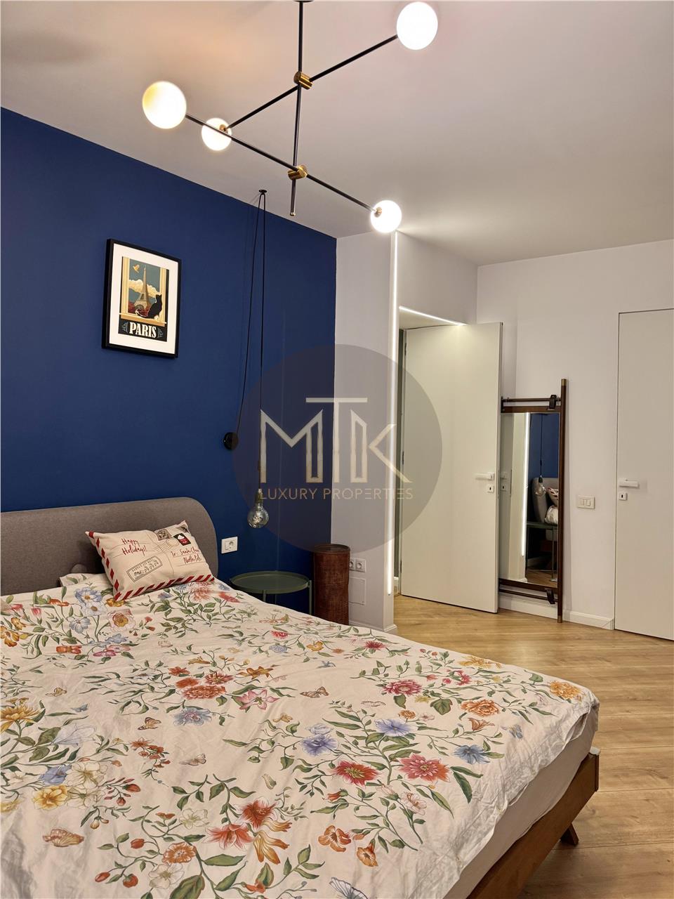 Apartamentul este decomandat si compartimentat astfel: living open-space cu zona de dining si bucatarie, cu iesire pe balconul de 5 mp, 1 dormitor matrimonial, dotat cu pat king-size, dressing, birou si baie proprie cu cada, cel de-al 2 lea dormitor, cu pat king-size, dressing, ideal pentru camera de copii, birou etc. Decomandarea eficienta a camerelor este facuta de hol, unde se regaseste cea de-a 2-a baie, dotata cu cabina de dus de tip walk-in.