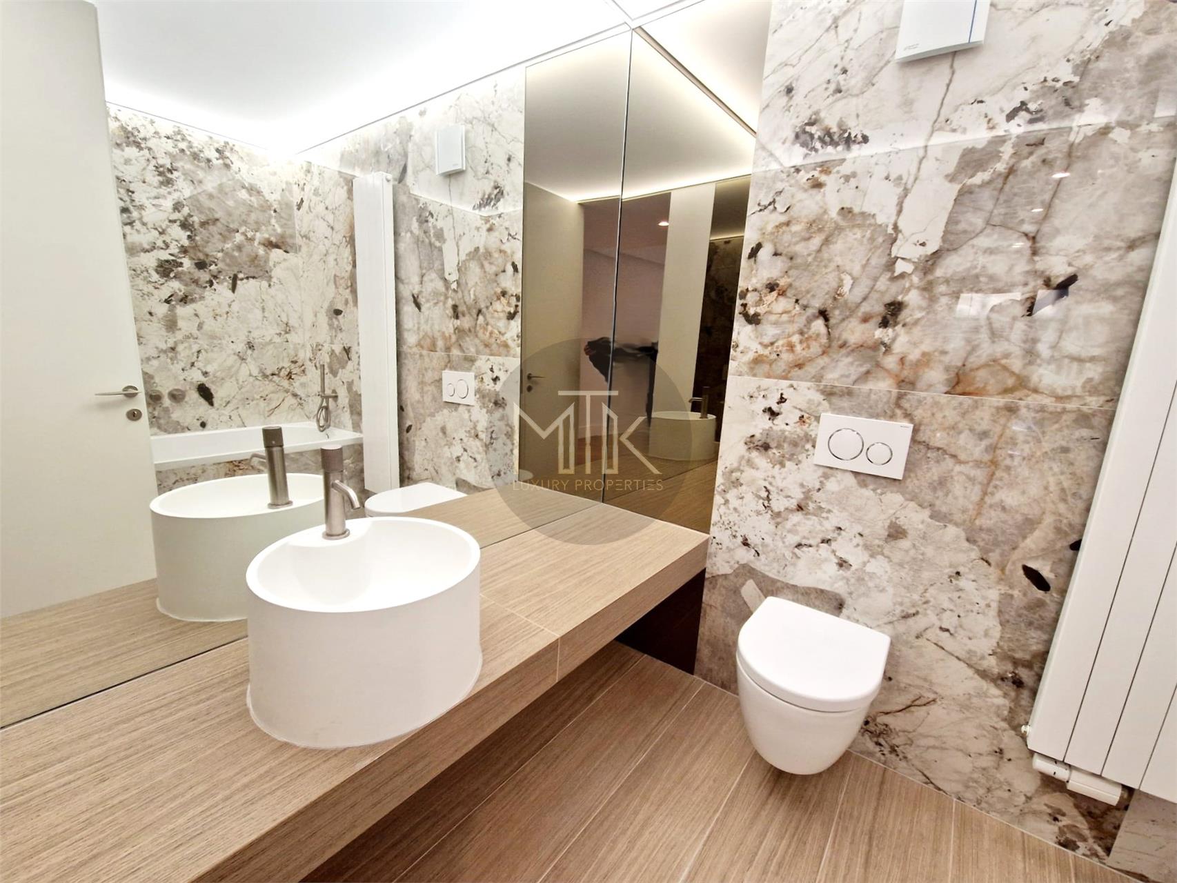 Apartamentul se afla la etajul 6 dintr-un imobil cu regim de inaltime P+8 si este compus dintr-un living spatios, bucatarie open space, 2 dormitoare, o baie cu cada, un grup sanitar si o terasa de 12MP cu vederea in interiorul complexului. Dintre finisajele apartamentului amintim: parchet din lemn triplu stratificat,tamplarie din aluminiu Schuco cu geam tripan, obiecte sanitare de la Daniel Rubinetterie, usi interioare de tip Filomuro, usile de acces beneficiaza de sisteme de siguranta contemporane, sistem de incalzire prin pardoseala. Exista climatizare centralizata si convectoare casetate.