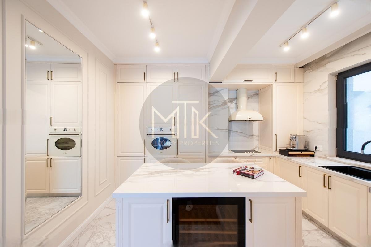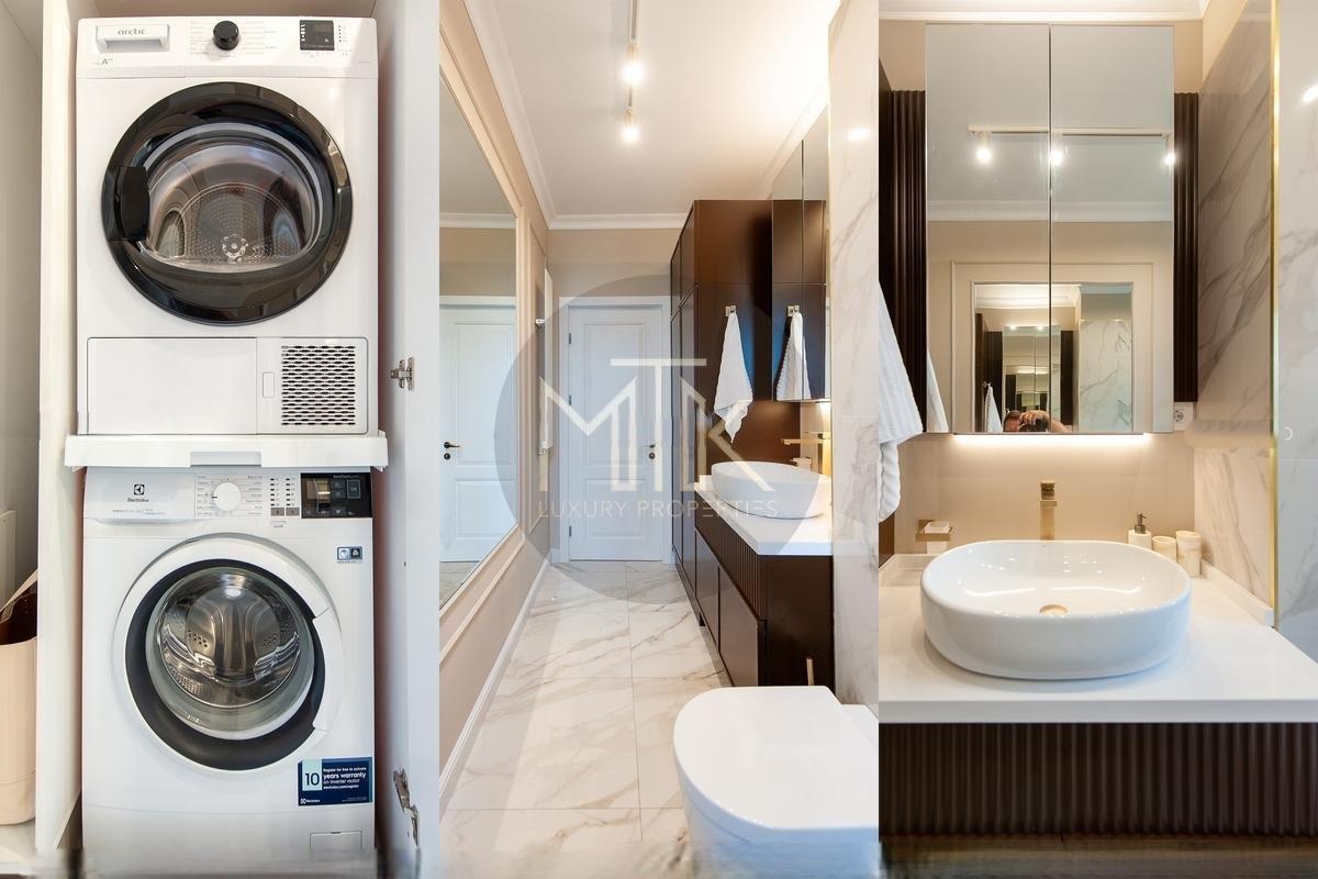 * Bucătăria este un punct forte al locuinței, dotată cu o insulă centrală generoasă și finisaje premium din marmură. Electrocasnicele încorporate de ultimă generație și corpurile de iluminat pendul aduc un plus de stil și funcționalitate;