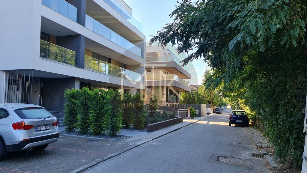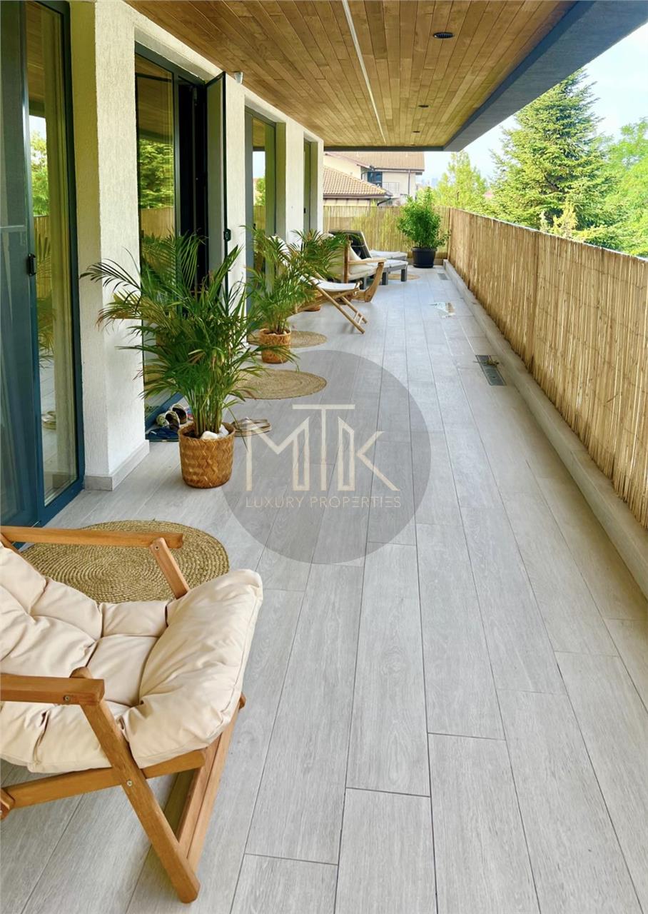 Apartamentul se afla la etajul 2 intr-un bloc boutique cu 3 etaje, si este compartimentat dupa cum urmeaza: living luminos si spatios de 31MP, o bucatarie open space cu zona de bar, dormitor matrimonial cu baie proprie si dressing (19mp), 2 dormitoare secundare, o a doua baie cu dus de tip walk in, dressing, un hol de acces cu vestibul, terasa de 60 mp, cu lemn natural si lumini cu led si senzor care se intinde de jur imprejurul apartamentului, accesul fiind posibil din orice incapere.