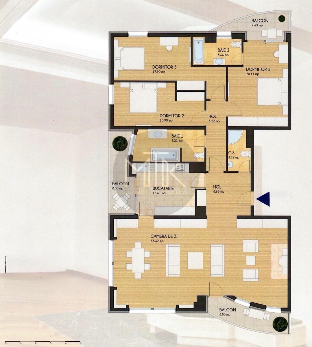 - 3 dormitoare ( 1 dormitor beneficiaza de baie proprie cat si iesire pe terasa de 5MP);
