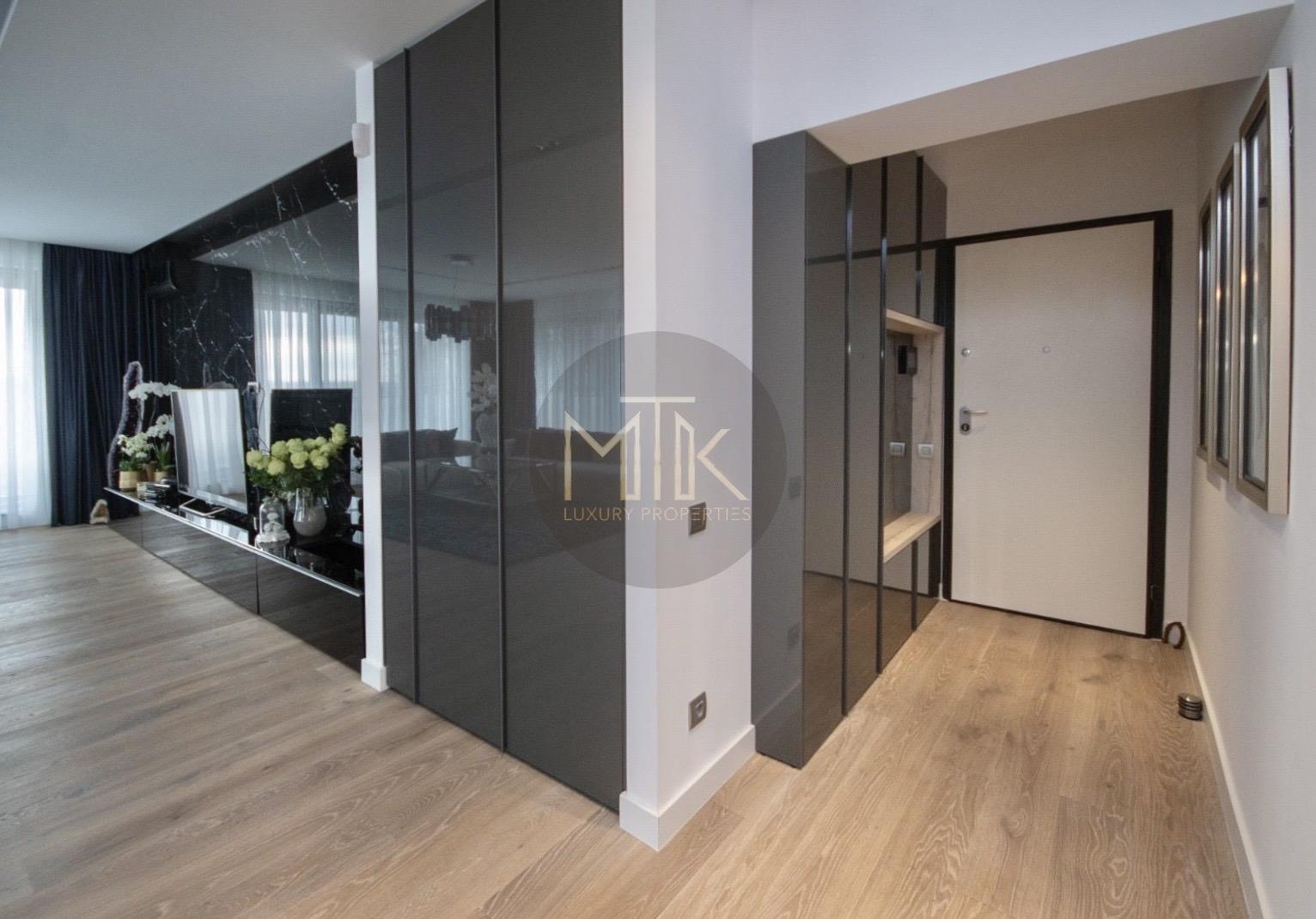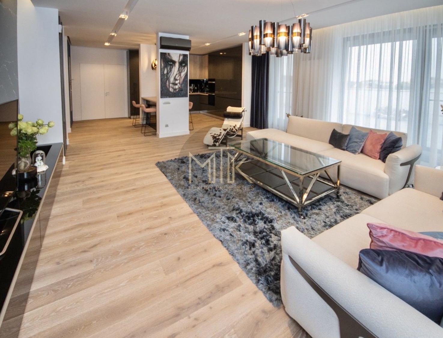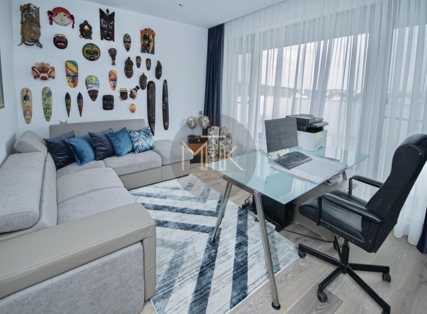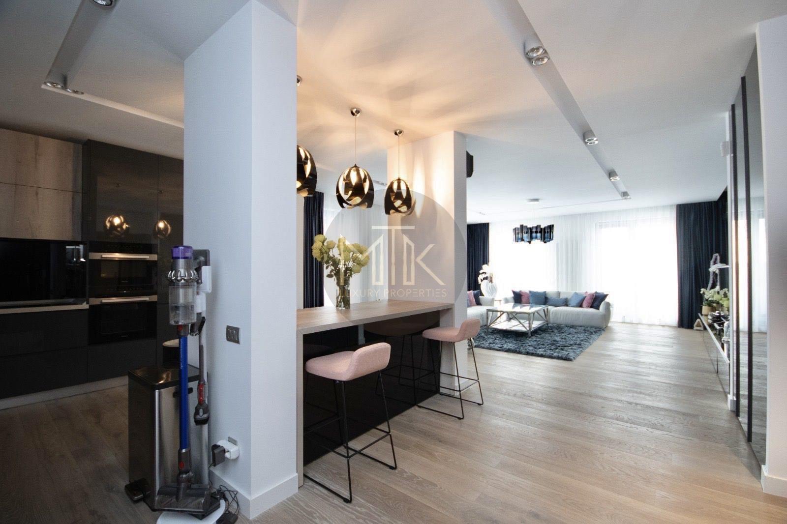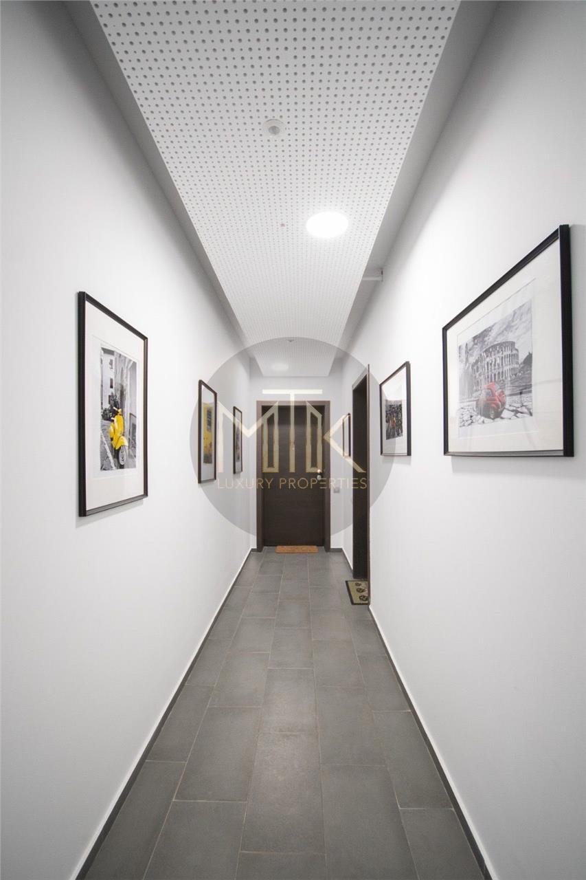 Compartimentarea este generoasa si foarte bine gandita pentru confortul zilnic. Livingul are o suprafata de 45 mp si include un semineu pe bioetanol, fiind un spatiu luminos si primitor. Bucataria de 14 mp este complet mobilata si echipata cu electrocasnice Miele de ultima generatie. Zona de noapte cuprinde un dormitor matrimonial de 30 mp cu acces la balcon, o baie dedicata de 12 mp si un dressing separat, extrem de spatios, de 15 mp. Locuinta mai dispune de un al doilea dormitor de 16 mp, care poate fi utilizat si ca birou, o baie de serviciu de 7 mp si un hol de primire de 8 mp.