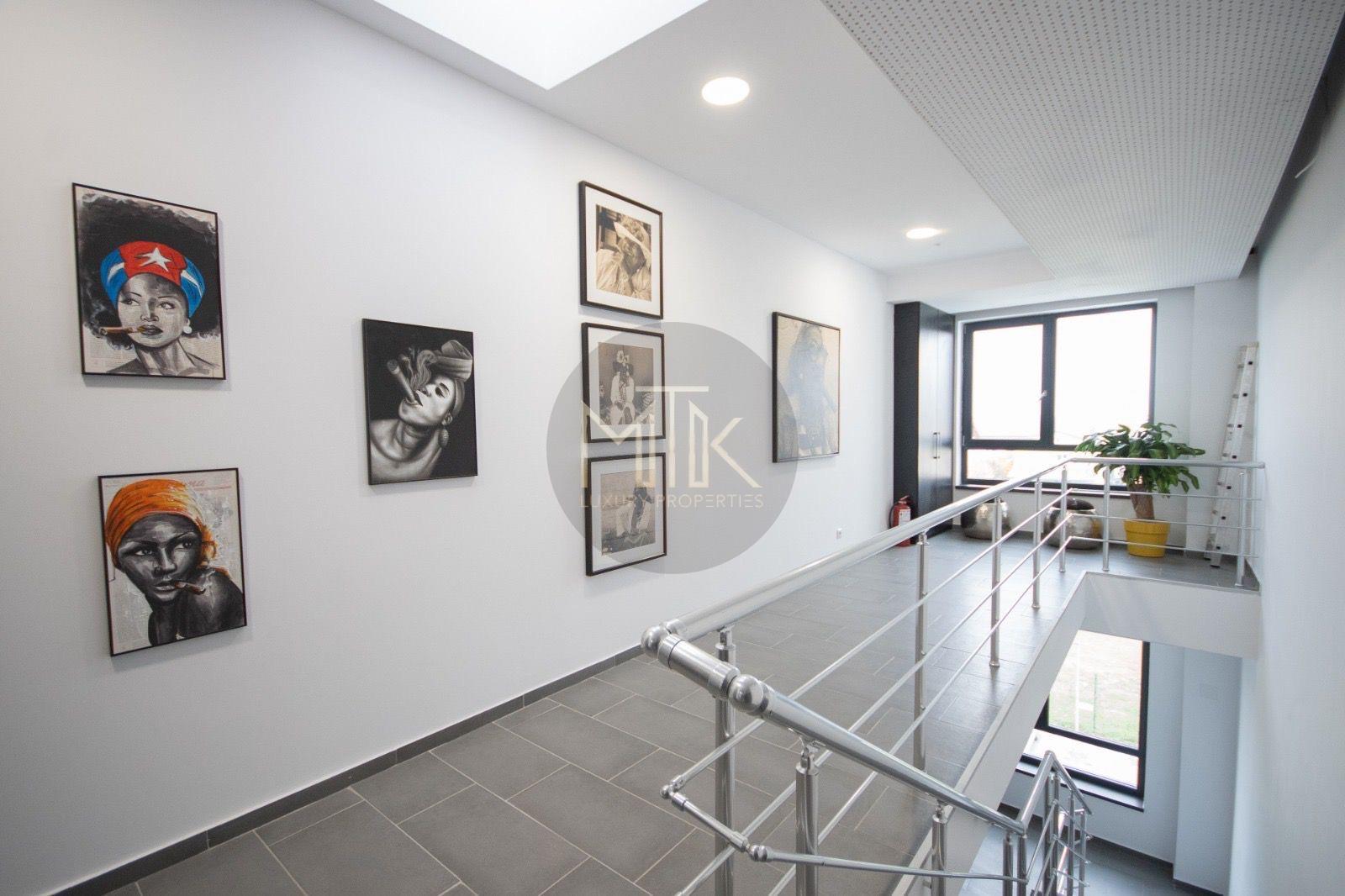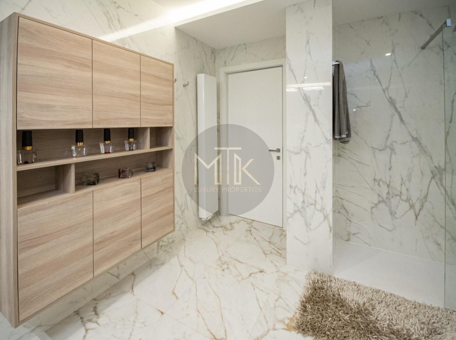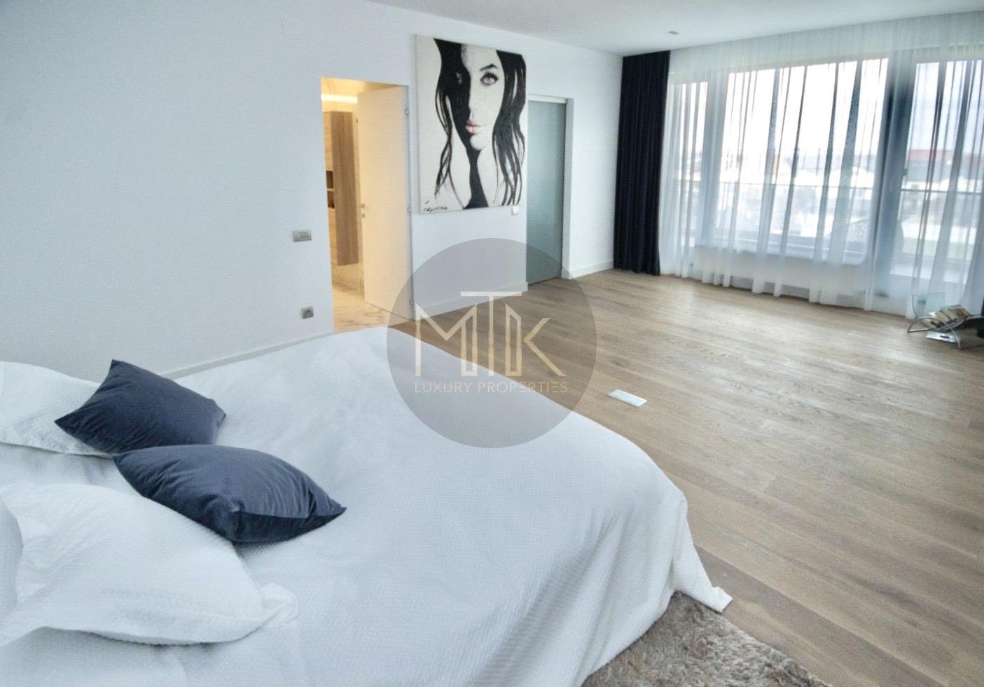 Confortul este intregit de sistemul de incalzire cu centrala Buderus si calorifere de design, infrastructura completa de internet si interfon, intreaga locuinta fiind decorata cu mobilier de la Rovere si draperii premium.