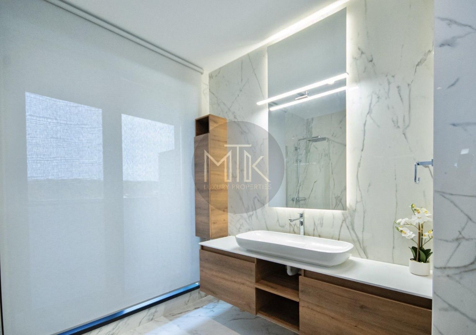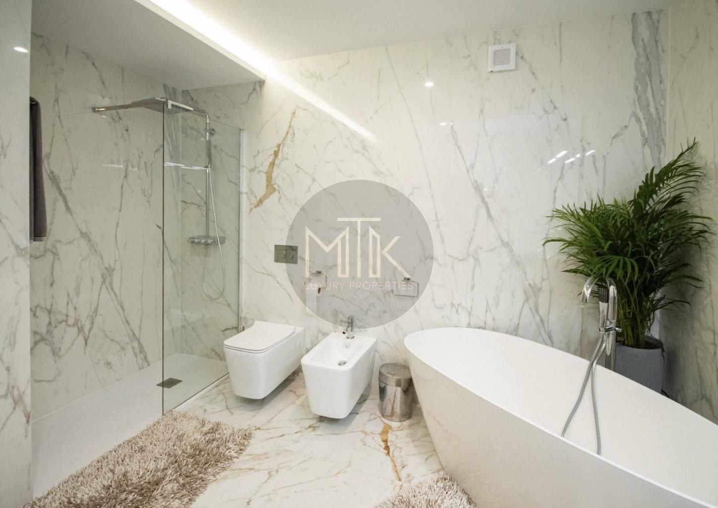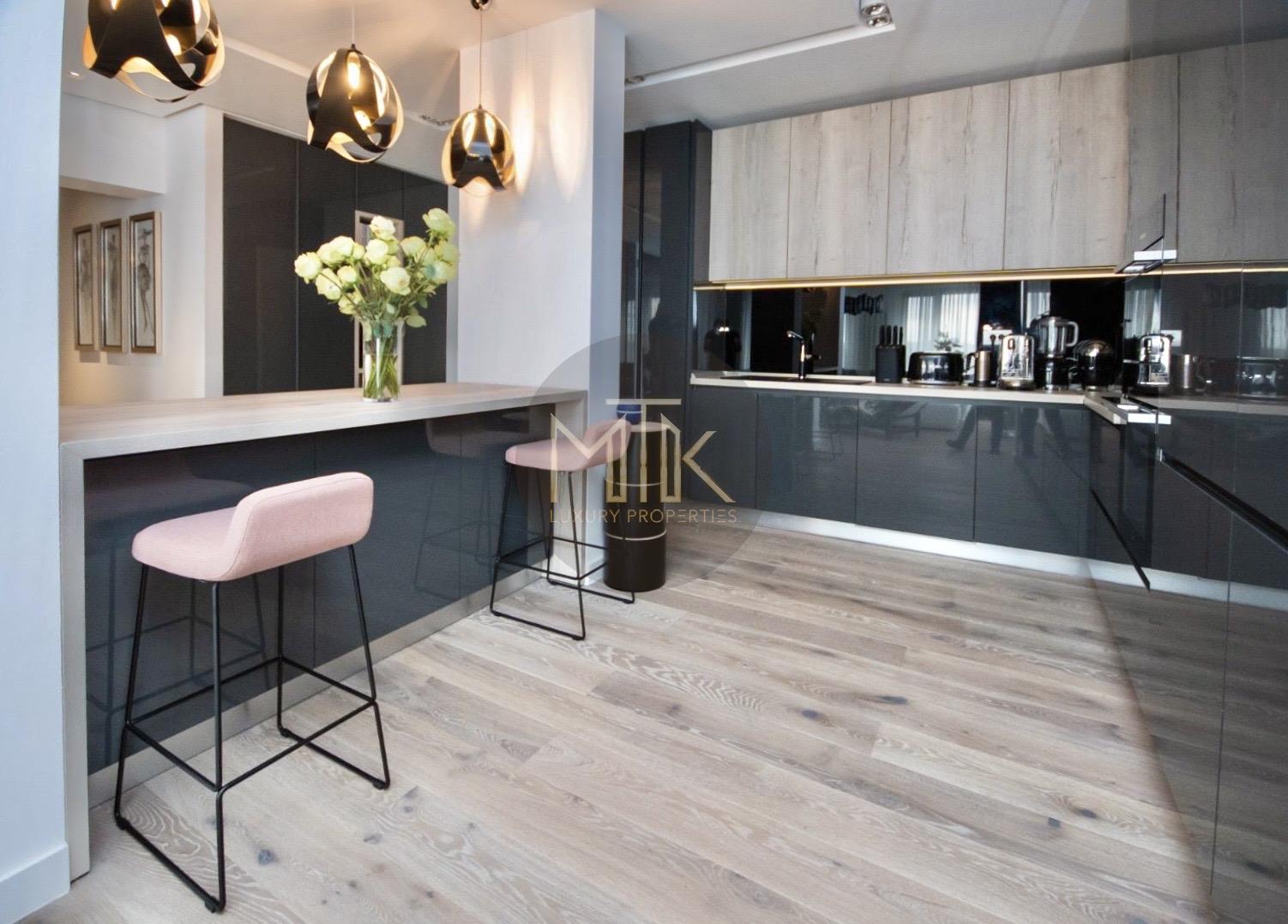 Confortul este intregit de sistemul de incalzire cu centrala Buderus si calorifere de design, infrastructura completa de internet si interfon, intreaga locuinta fiind decorata cu mobilier de la Rovere si draperii premium.