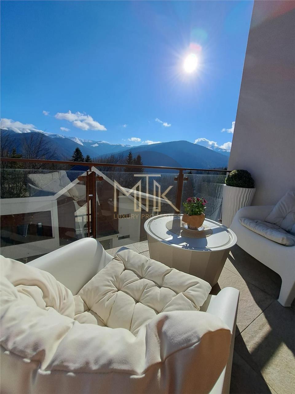 Apartamentul beneficiaza vedere panoramica neobstructionata asupra muntilor Bucegi, de lumina naturala pe tot parcursul zilei datorita spatiilor vitrate mari, creand o atmosfera placuta si primitoare, multiple spatii de depozitare fiecare camera avand un rol bine definit, decorat cu gust pentru a crea un mediu confortabil si primitor. Interiorul este finisat cu materiale de inalta calitate, incalzire prin pardoseala, semineu minimalist si corpuri de iluminat arhitecturale.