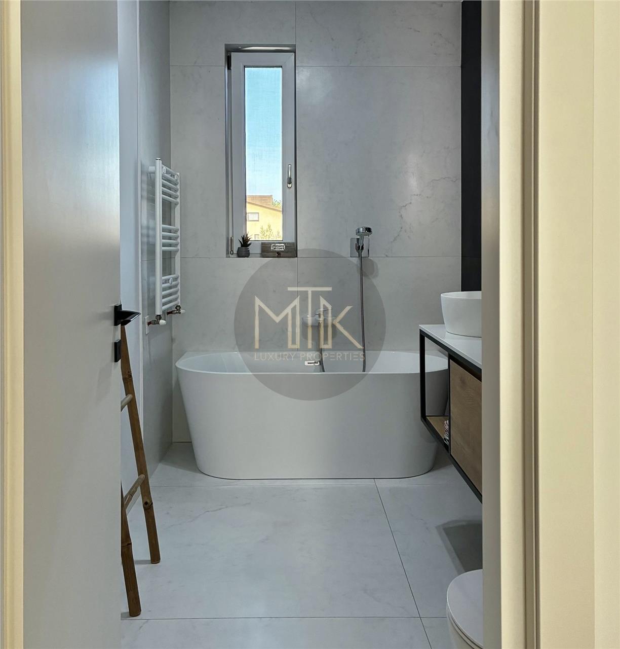 Locuinta beneficiaza de finisaje de top (Marazzi, Grohe, Ideal Standard) si dotari tehnice complete: centrala termica cu boiler propriu, put forat pentru irigatii si conectare la toate utilitatile publice.