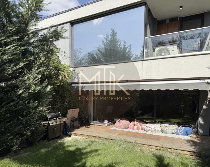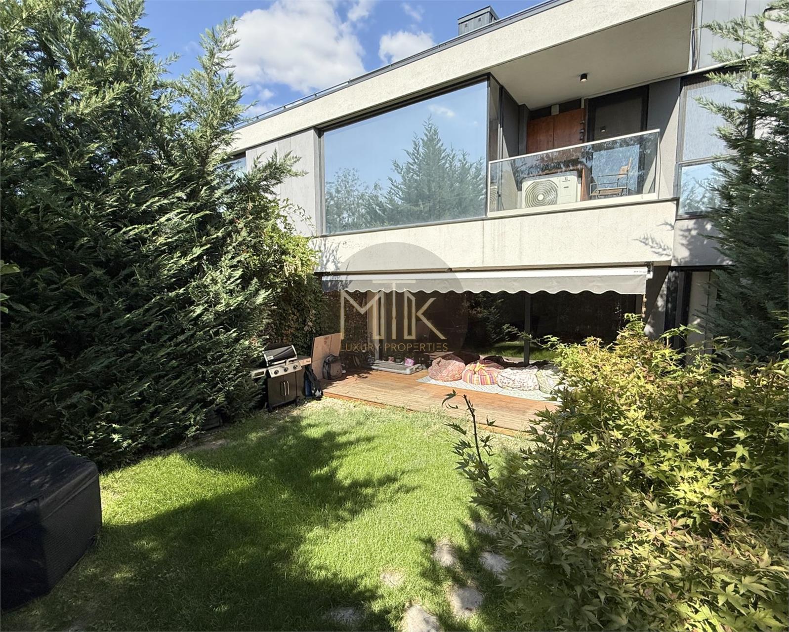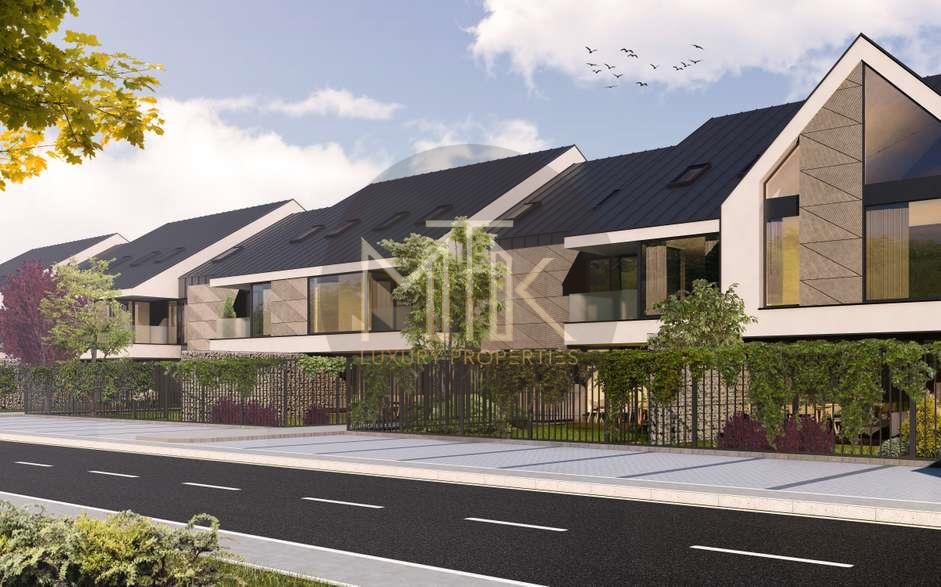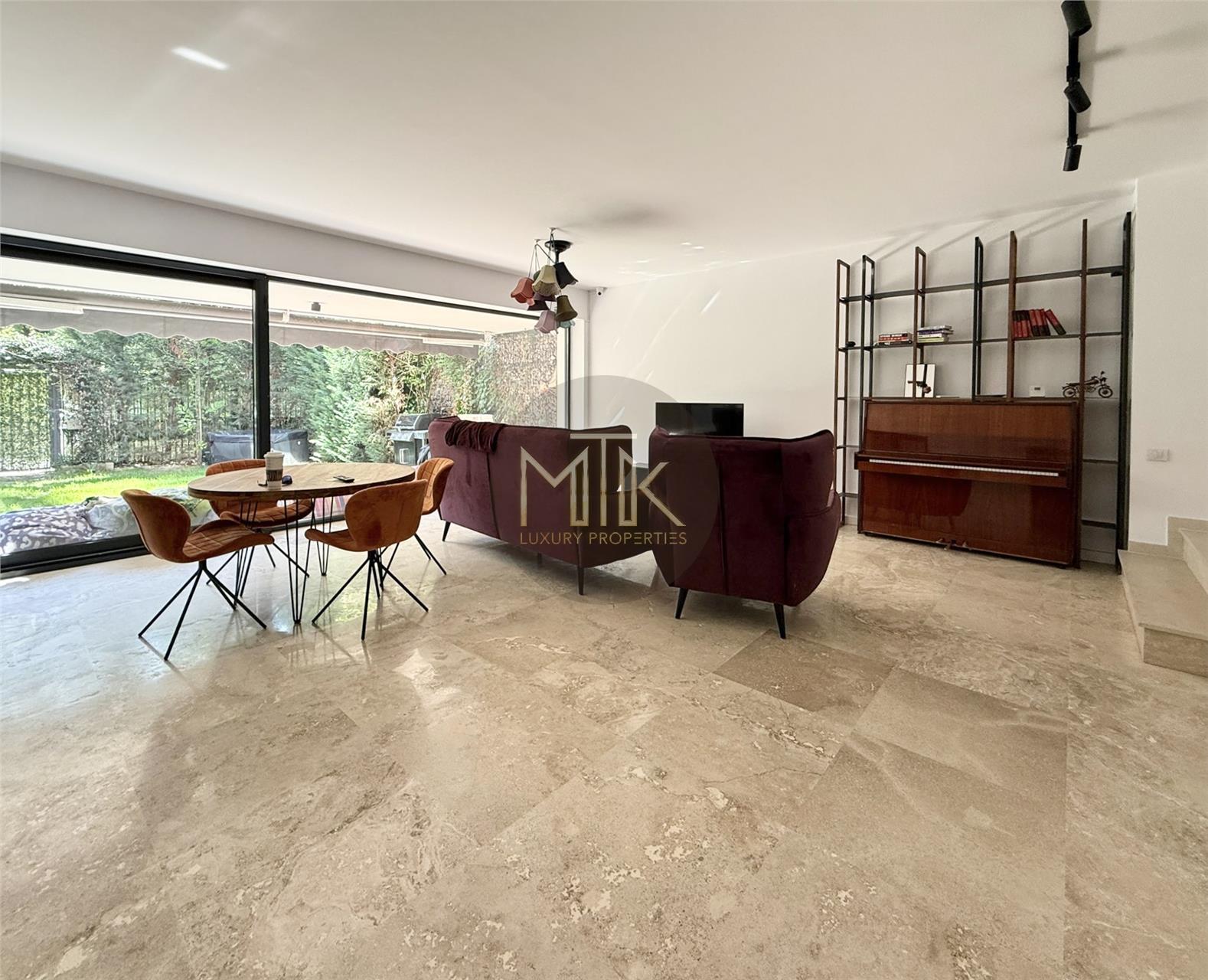 • Parter: living spatios cu iesire pe terasa, bucatarie inchisa cu usa din sticla securizata, baie de serviciu, hol, scari interioare cu balustrada din sticla, terasa acoperita cu pergola automatizata (senzori de ploaie si vant) si gradina