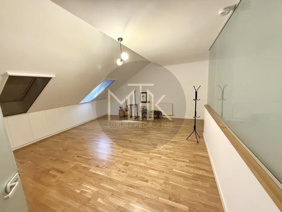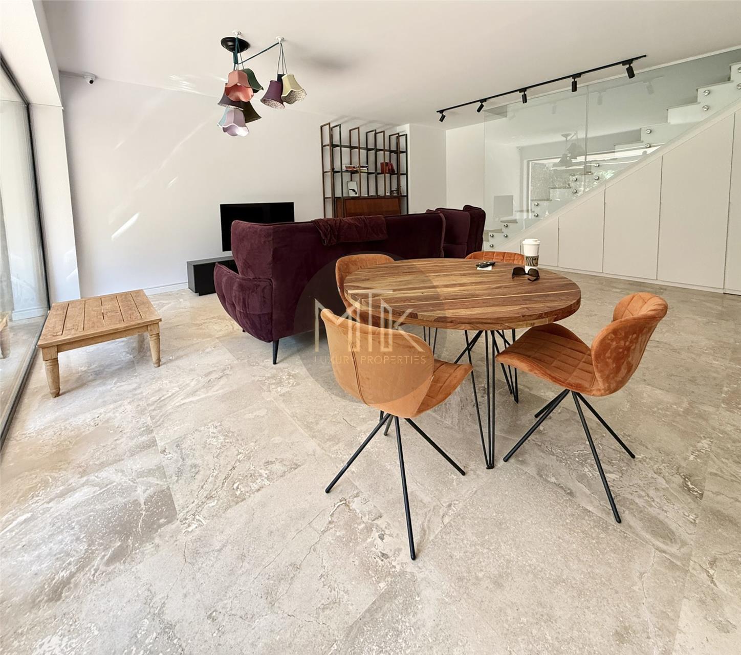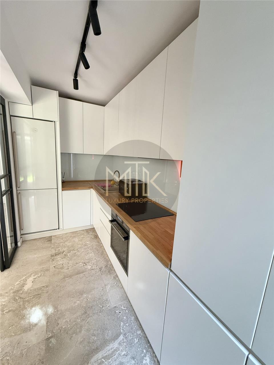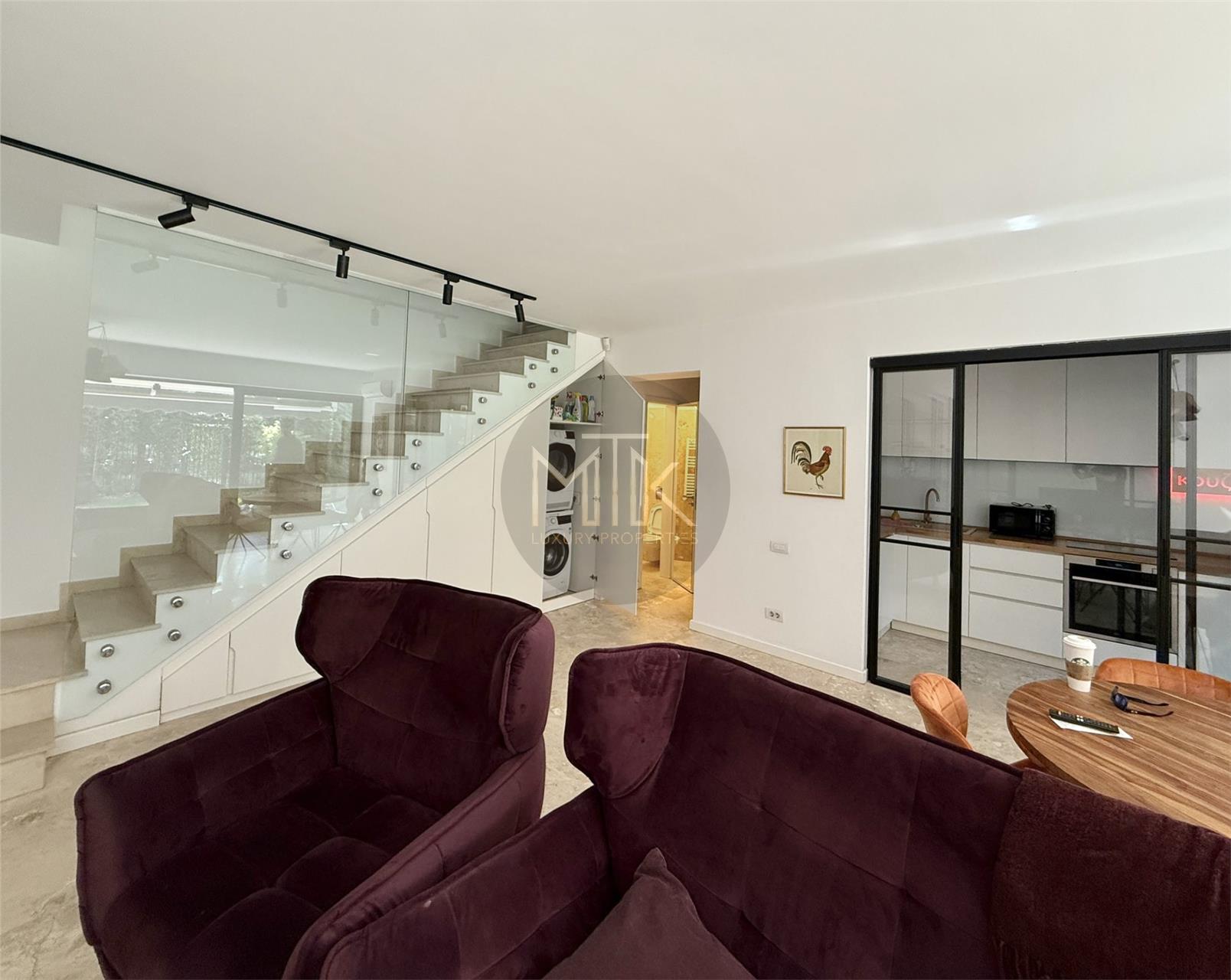 • Parter: living spatios cu iesire pe terasa, bucatarie inchisa cu usa din sticla securizata, baie de serviciu, hol, scari interioare cu balustrada din sticla, terasa acoperita cu pergola automatizata (senzori de ploaie si vant) si gradina